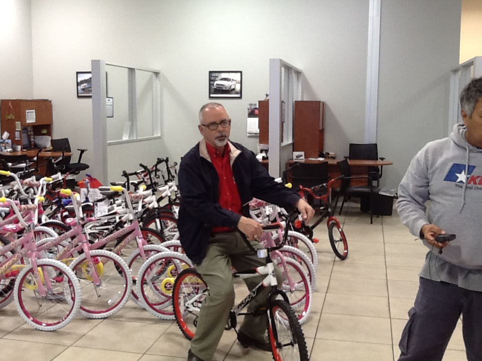 Friday, Jim Bass, along with employees of the auto dealership presented to Christmas in the Barrio coordinator Phillip Valadez 105 brand new bicycles and 35 new coats. The bikes and coats were donated by Jim Bass employees and by several customers. The collection of the bikes and coats was accomplished over a three week period.