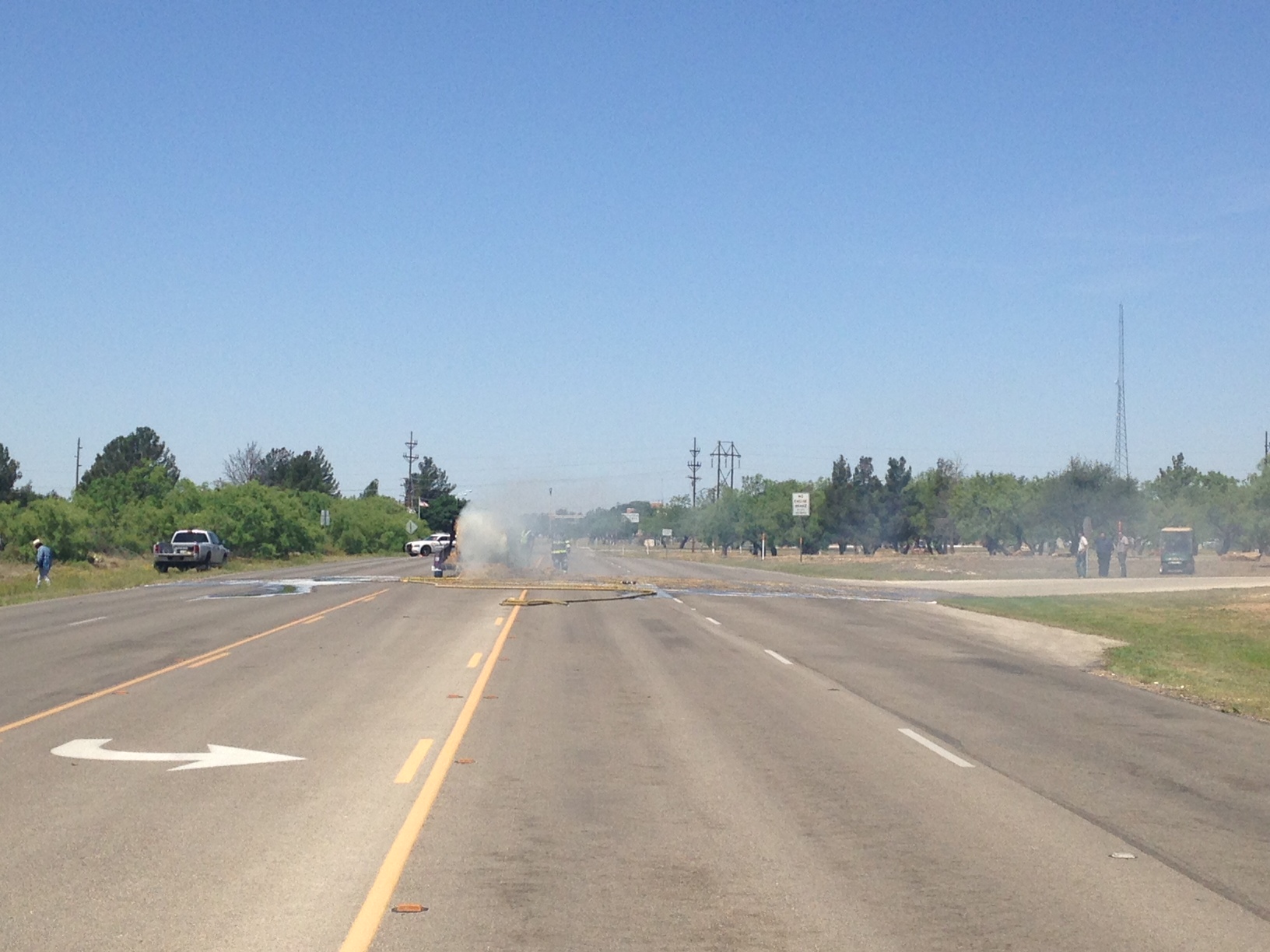 A bail of hay caught fire in the back of a truck. San Angelo Fire Department responded to the scene with full regalia, but there wasn't enough water. They contained the fire and have brought more water to the scene. A San Angelo police officer said that it may be 1 p.m. before the scene is cleaned up and back to normal.