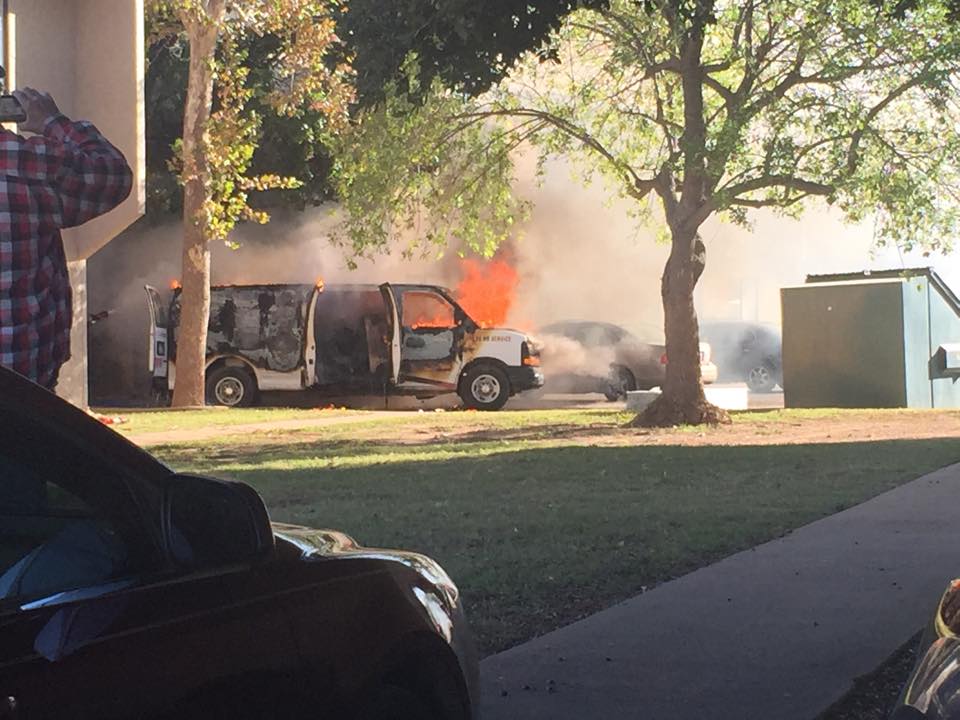 Karla Steppe said two employess were inside apartment 137 cleaning the apartment and were having suction problems, so they went outside and discovered the van was on fire.