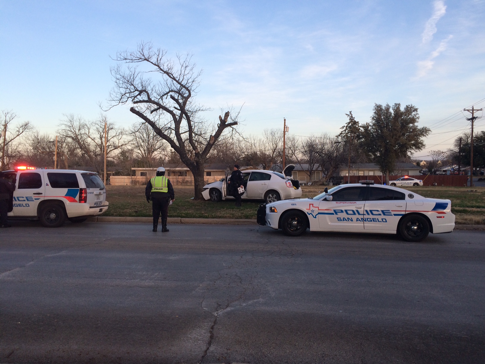 Several police units currently surround the intersection of Ave. N and A&M Streets, where a vehicle involved in a high-speed chase has jumped a curb and crashed into the only tree within 40 meters.