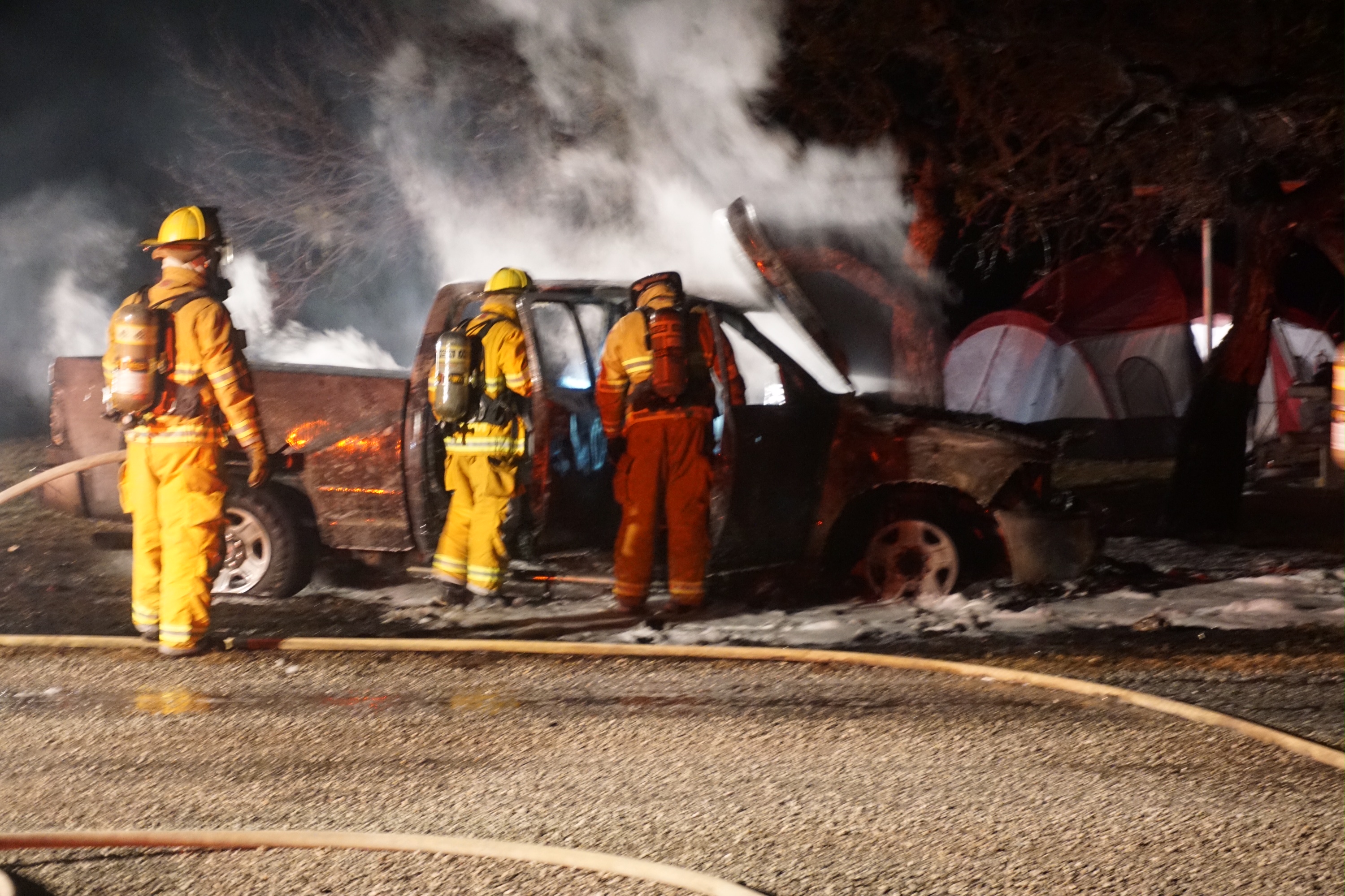 Scott Martin of Midland was camping at the park with friends. It was his truck. “We were sitting here listening to the radio and went to air-up the air mattress, and I looked out the tent and there was a glow, a big ‘ol glow,” Martin said. “I got 20-30 feet from it and it started poppin’ and I took off from that to get away from it.” Martin called 911. His truck was a 2014 Ram 1500, he said.