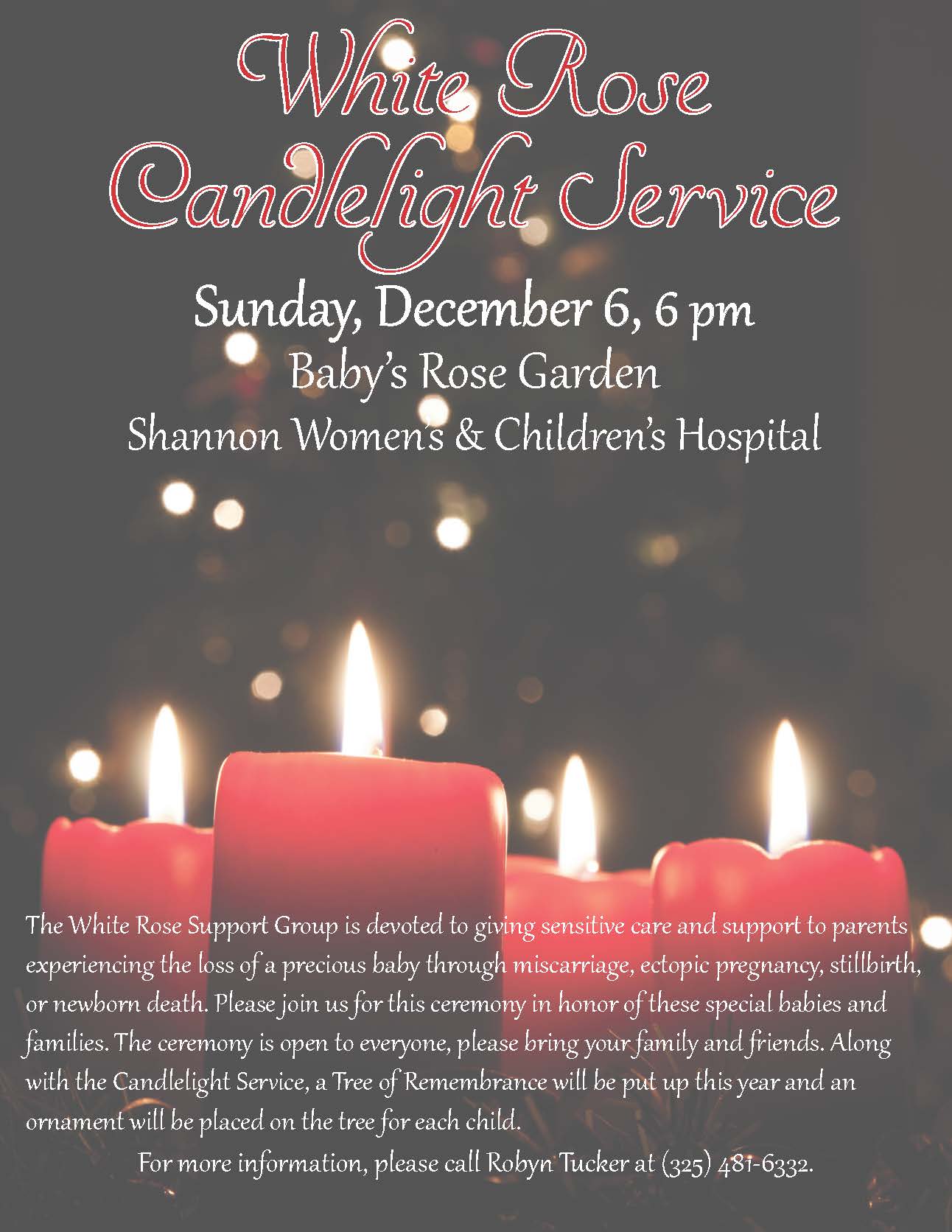 The White Rose Bereavement Group will be hosting a candlelight service in the Baby Rose Garden at the Shannon Women's & Children's Center, said a press release Tuesday. The service, which is open to the public, will take place at 6 p.m. on December 6.