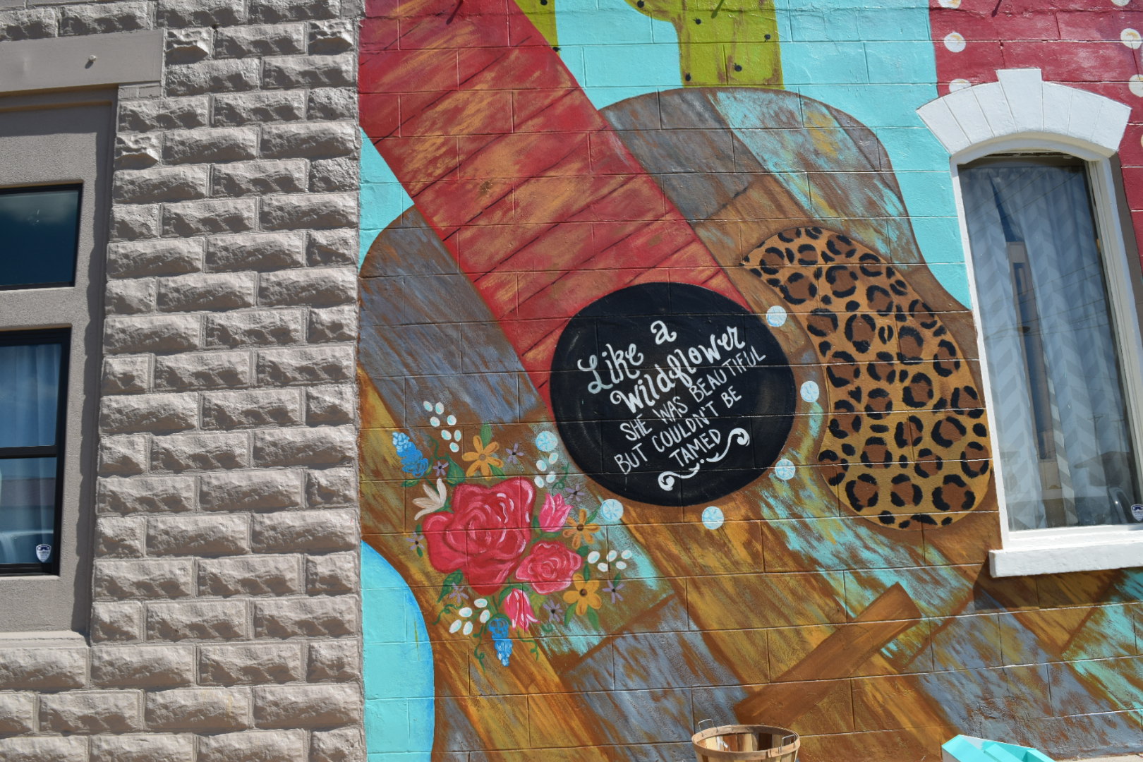 Megan Smith, co-owner of Burlap & Paisley, brought it upon herself to create a mural that features items representative of different aspects inside the store. The blonde model holding the hairdryer is representative of the salon inside; the guitar represents the company's early beginnings in which Smith would restore guitars; and the vintage suitcase represents the journey it has experienced.