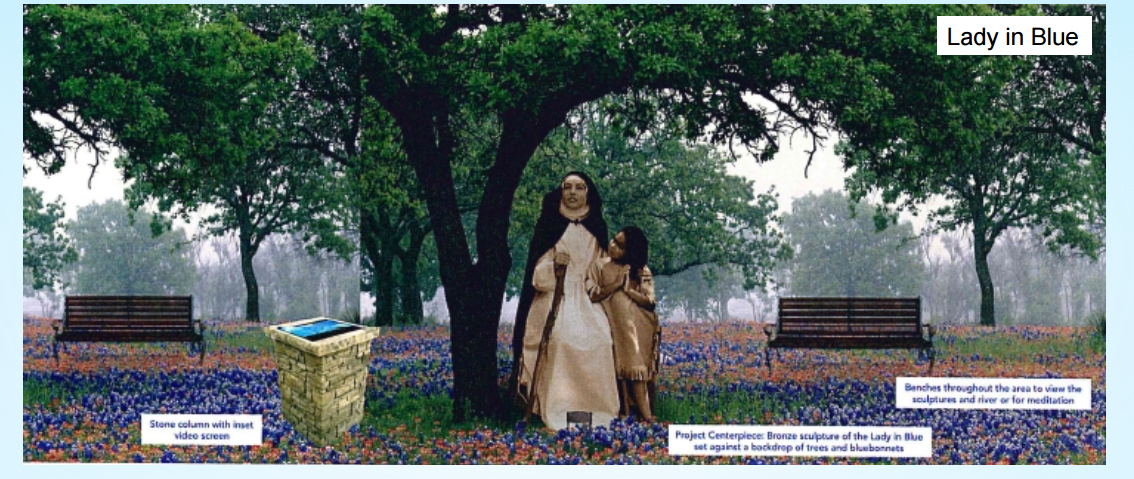 The “Lady in Blue” sculpture does give the appearance of a Catholic nun, an apparition the Jumano Indian tribe saw at the confluence of the Conch River in the early 1600s. The Jumano Indians said she preached to them Christianity in their own language.