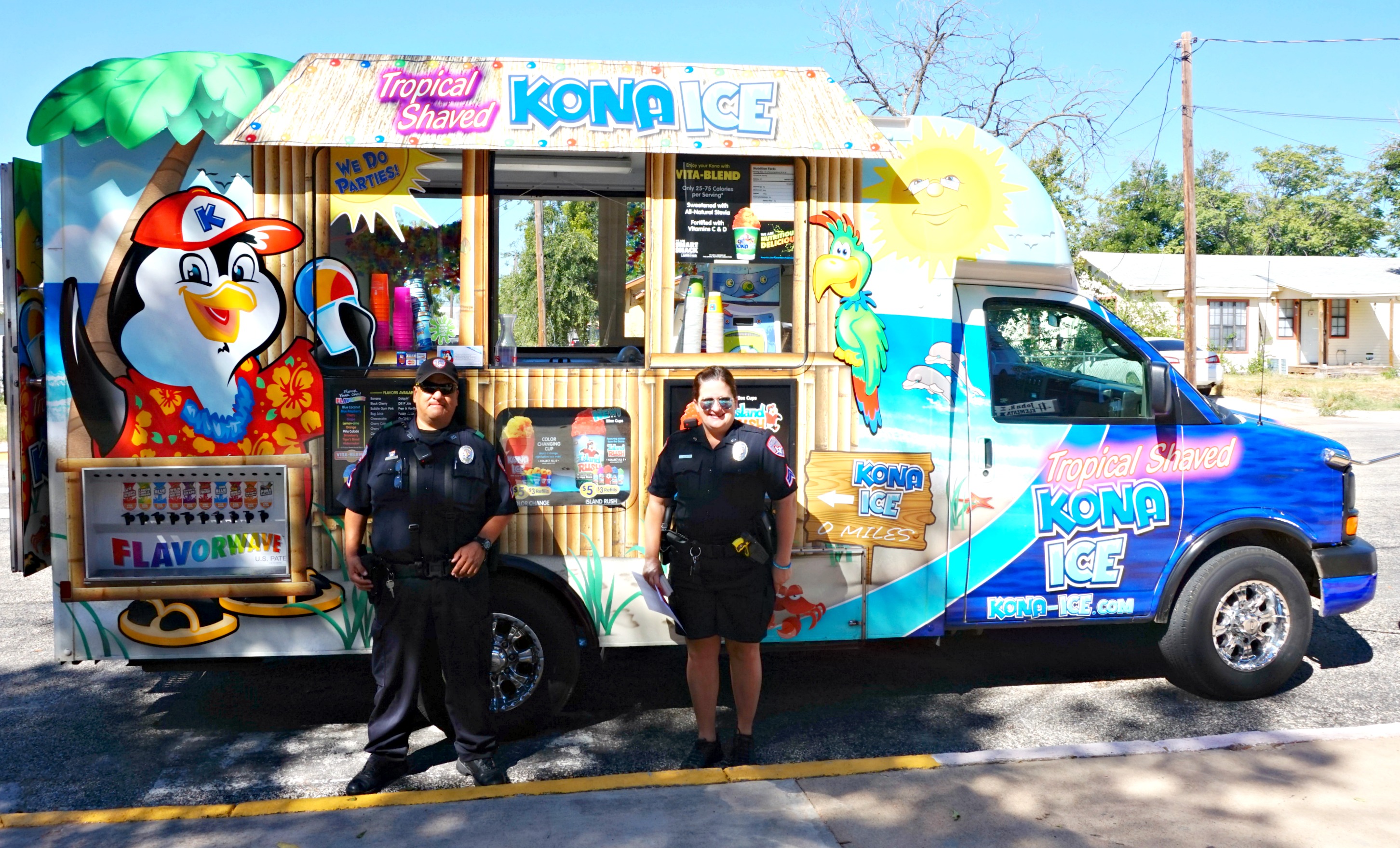 Today, the San Angelo Police Department’s D.R.E.A.M. (Drug Resistance Education and Mentoring) Officers teamed up with Carlos Rodriguez from Kona Ice of San Angelo to bring a cool treat to local students and teachers who are preparing to head back to school.