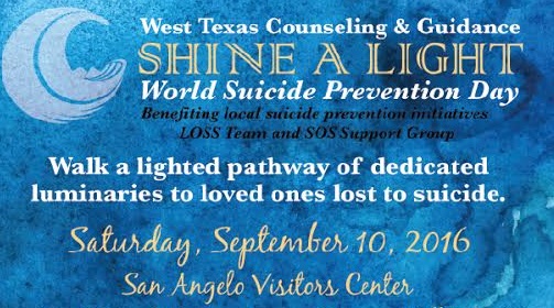 Tiffany Talley, Director of Development & Community Relations, for West Texas Counseling and Guidance Center, said, "In an effort to help raise awareness of how we can reach out and change the devastating results of suicide and promote education and intervention, this Saturday, the WTCG will be hosting an event downtown. September 10 is 'World Suicide prevention Day' and we will hold our first annual Shine A Light on a dark topic event.
