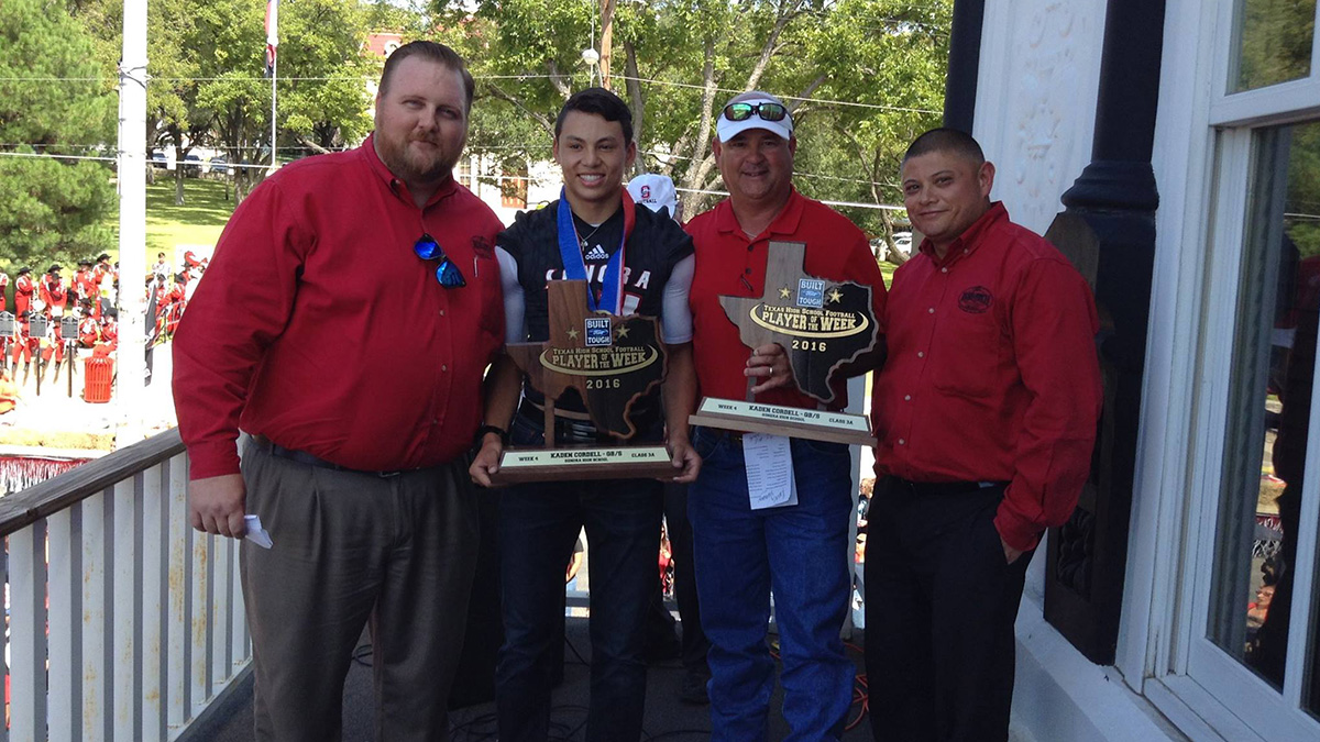 SAN ANGELO,TX- Jim Bass Ford awarded Kaden Cordell, Jr., a junior and quarterback for the Sonora, Texas Broncos for being selected as the 2016 Built Ford Tough Texas High School Player of the Week. A trophy presentation took place on Sept. 30 during a city-wide parade and pep rally.