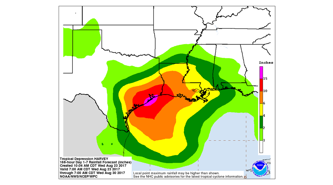 Harvey is expected to produce total rain accumulations of 10 to 15 inches by Tuesday along the middle and upper Texas coast including the cities of Houston and Galveston.