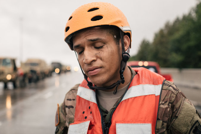 One picture caught the anguished expression of Sgt. Nicolas Carson of San Angelo. He is serving as a National Guardsman out of San Angelo, the Times stated. The photo was taken near Loop 610 in Houston. That freeway wraps around all four sides of Houston with downtown in the center.
