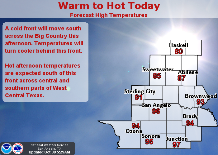 SAN ANGELO, TX -- Forecasters with the National Weather Service in San Angelo expect daytime temperatures Columbus Day to reach 96 degrees then plummet behind a cold front tonight to the upper 40’s.
