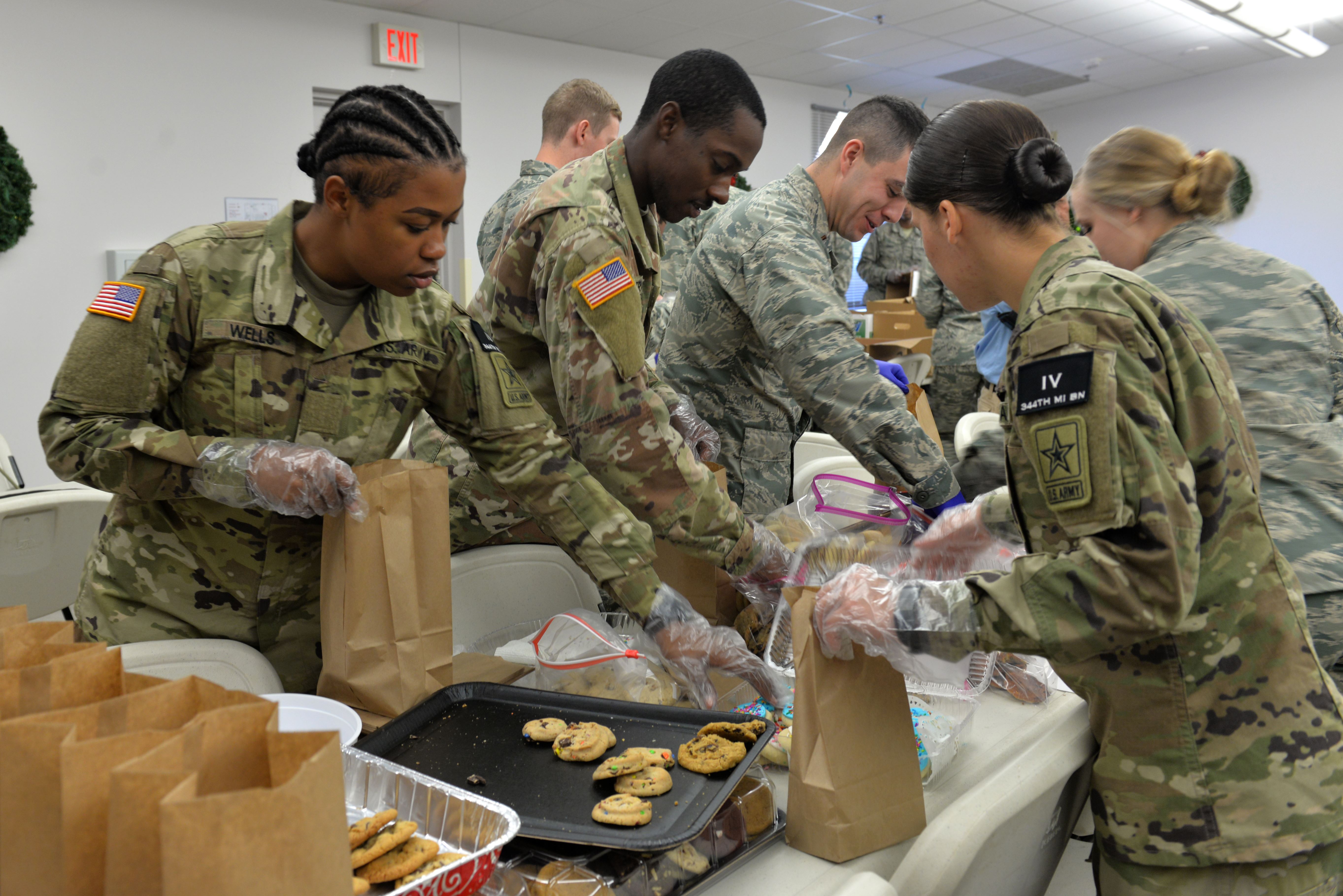 Volunteers created an assembly line of bagging and replenishing cookies. Pvt. Kiara Wells, 344th Military Intelligence Battalion trainee, spoke while filling cookie bags.