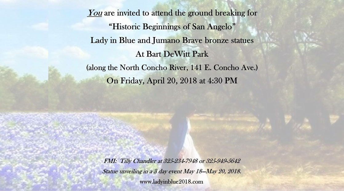 SAN ANGELO, TX -- The public is invited to a groundbreaking Friday for two new bronze larger-than-life statues depicting Historic Beginnings of San Angelo’s Lady in Blue and Jumano Brave that will be place in Bart Dewitt Park on the Concho River downtown.
