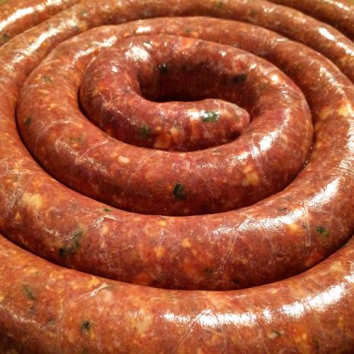 “The process includes cutting the pork and beef, grinding it, adding spices and stuffing the sausage into natural casings.” Gully described. “Then it’s cold smoked using mesquite only and chilled Saturday before the festival.”