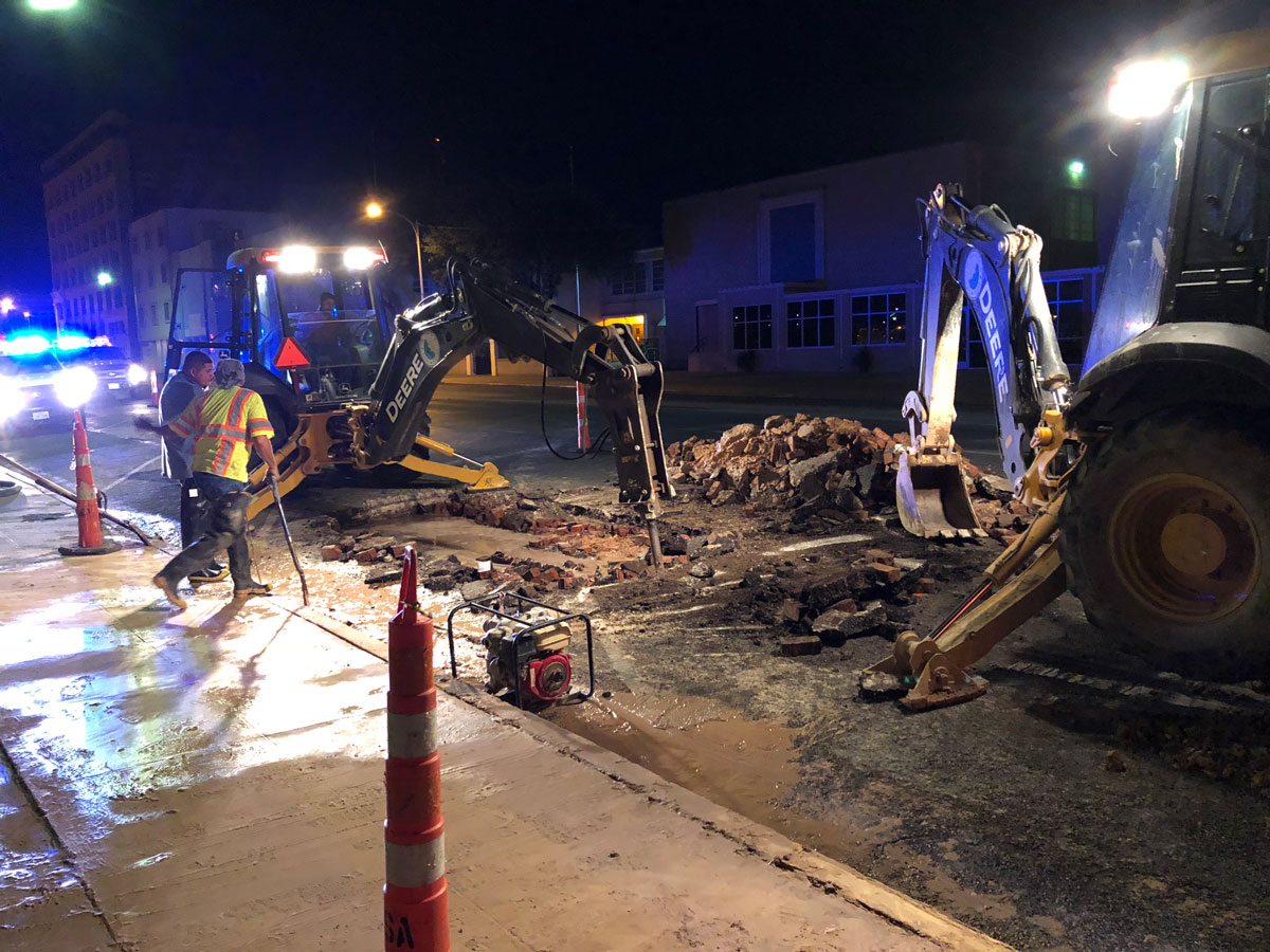 Someone reported the leak around 9 p.m. Saturday night (May 12) and City crews arrived shortly thereafter and shut off the water. After determining where the busted part of the pipe was, the crews began to dig.