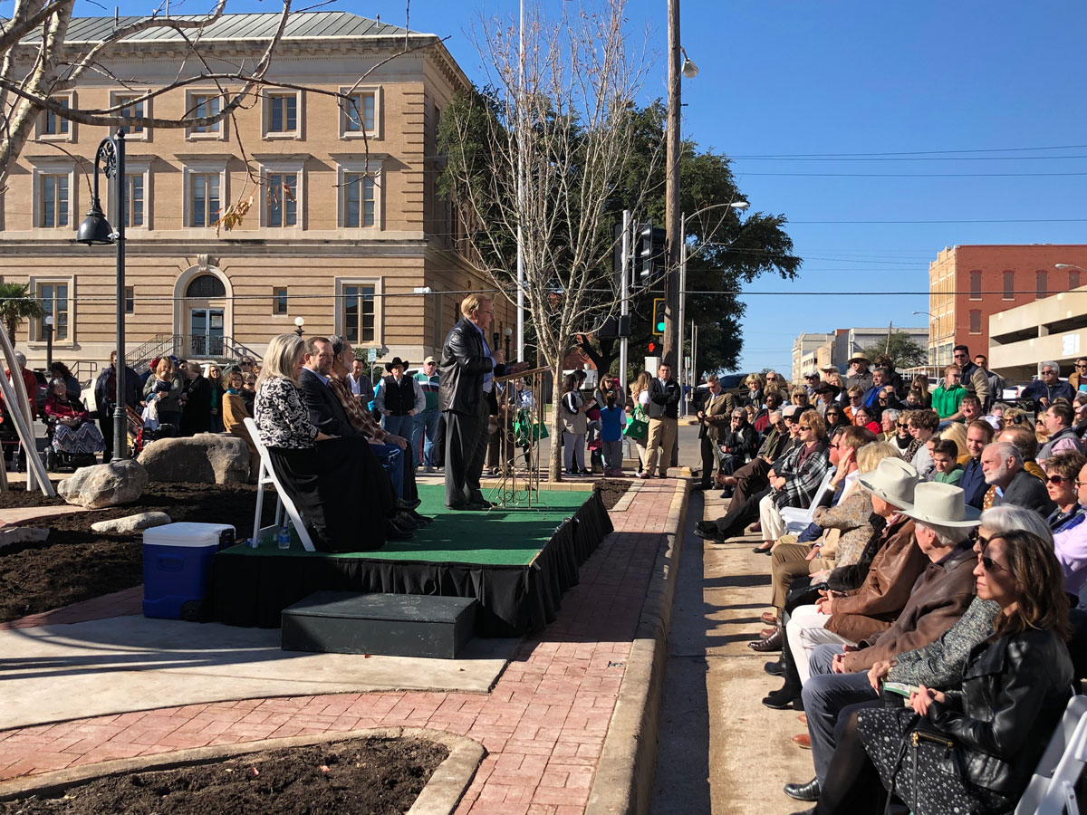 SAN ANGELO, TX — The grand opening of the Heritage Park Saturday morning, Nov. 17, was a success. Heritage Park’s lead salesman, Lee Pfluger, was flanked by the head of the 1992 R/UDAT study that envisioned the small pocket park, Frank Gray; Matt Lewis, who managed the non-profit donations and endowment to maintain the park at the San Angelo Area Foundation; and the San Angelo ISD Director of Curriculum and Instruction Jana Reuter. Together, they introduced the park to a large and appreciative crowd.