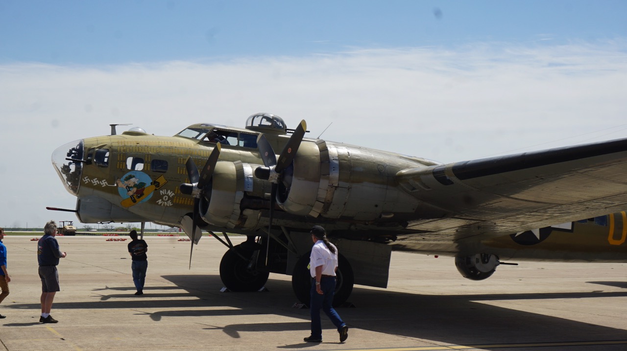 The Collings Foundation, located in Stow, Massachusetts, tours the country with their old warbirds. Three of the warbirds stopped through San Angelo April 4, 2018. The B-17, nicknamed “Nine-O-Nine” was part of the three-plane stop through here. The P-51 arrived first and the B-17G arrived an hour later. That’s because the B-17 cruises at around 130 knots indicated airspeed and the P-51 cruises at 225 KIAS.