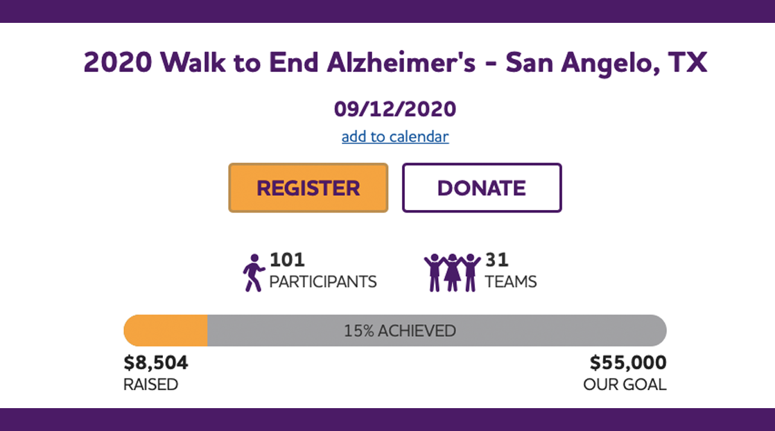 “Alzheimer’s is not taking a hiatus during COVID-19 and neither are we,” said Julie Gray, San Angelo Walk manager with the West Texas Chapter of the Alzheimer’s Association. “We must continue Walk to End Alzheimer’s, and we are working with all participants to ensure they have a powerful and moving experience that is felt when we are together. Many of our constituents are at higher risk when it comes to COVID-19 and we know that our volunteers and participants appreciate our commitment to keeping all involved healthy and safe.”