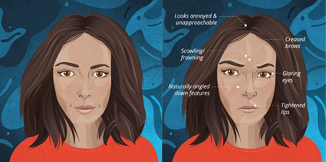 People who suffer from RBF are more likely to have naturally angled-down features, creased brows, glaring eyes, a natural frown, and tightened lips.