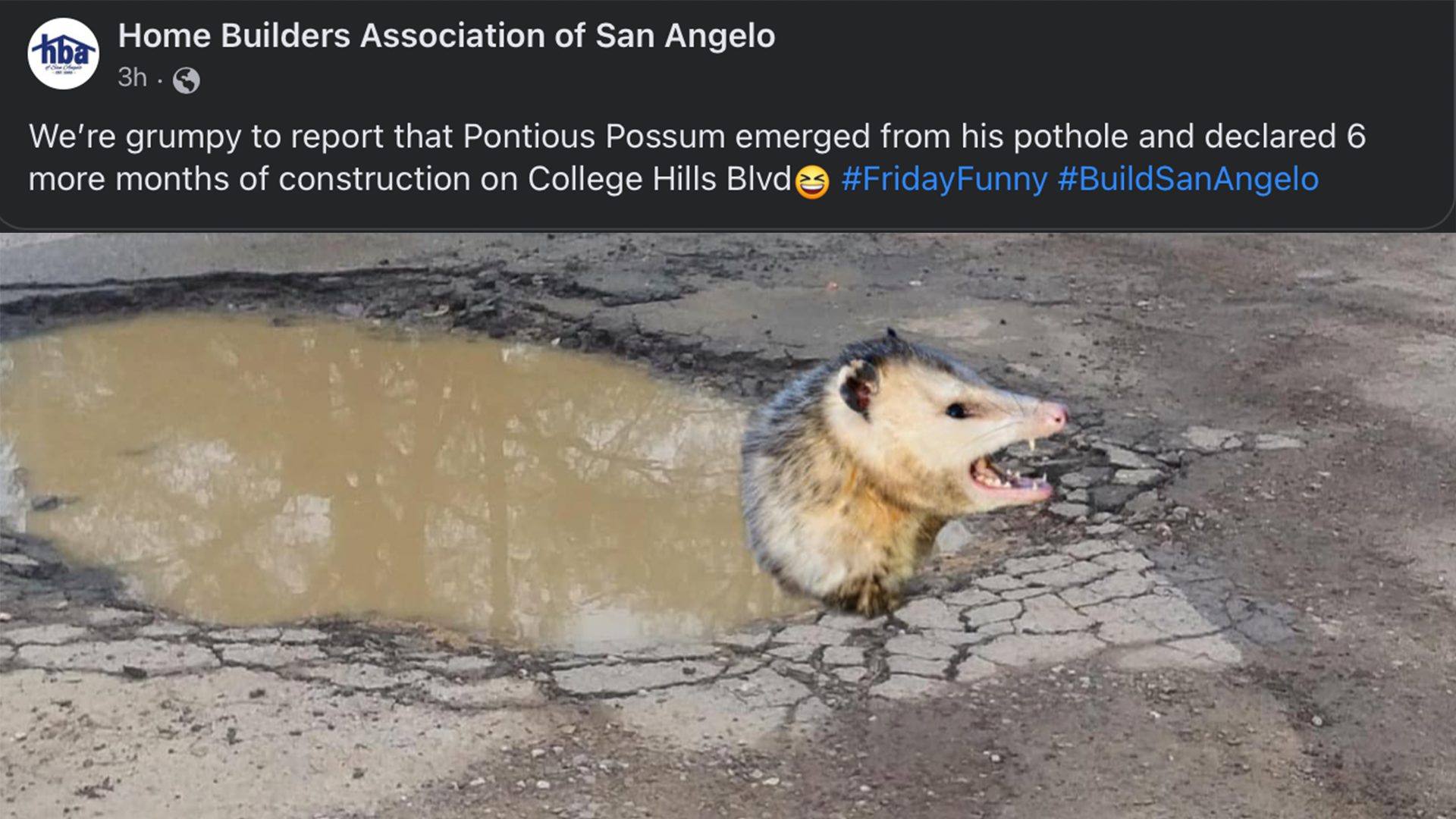 SAN ANGELO, TX – Pontious Possum of College Hills has spoken! Only six more months of construction on College Hills Blvd., jokes the local Home Builders Association.