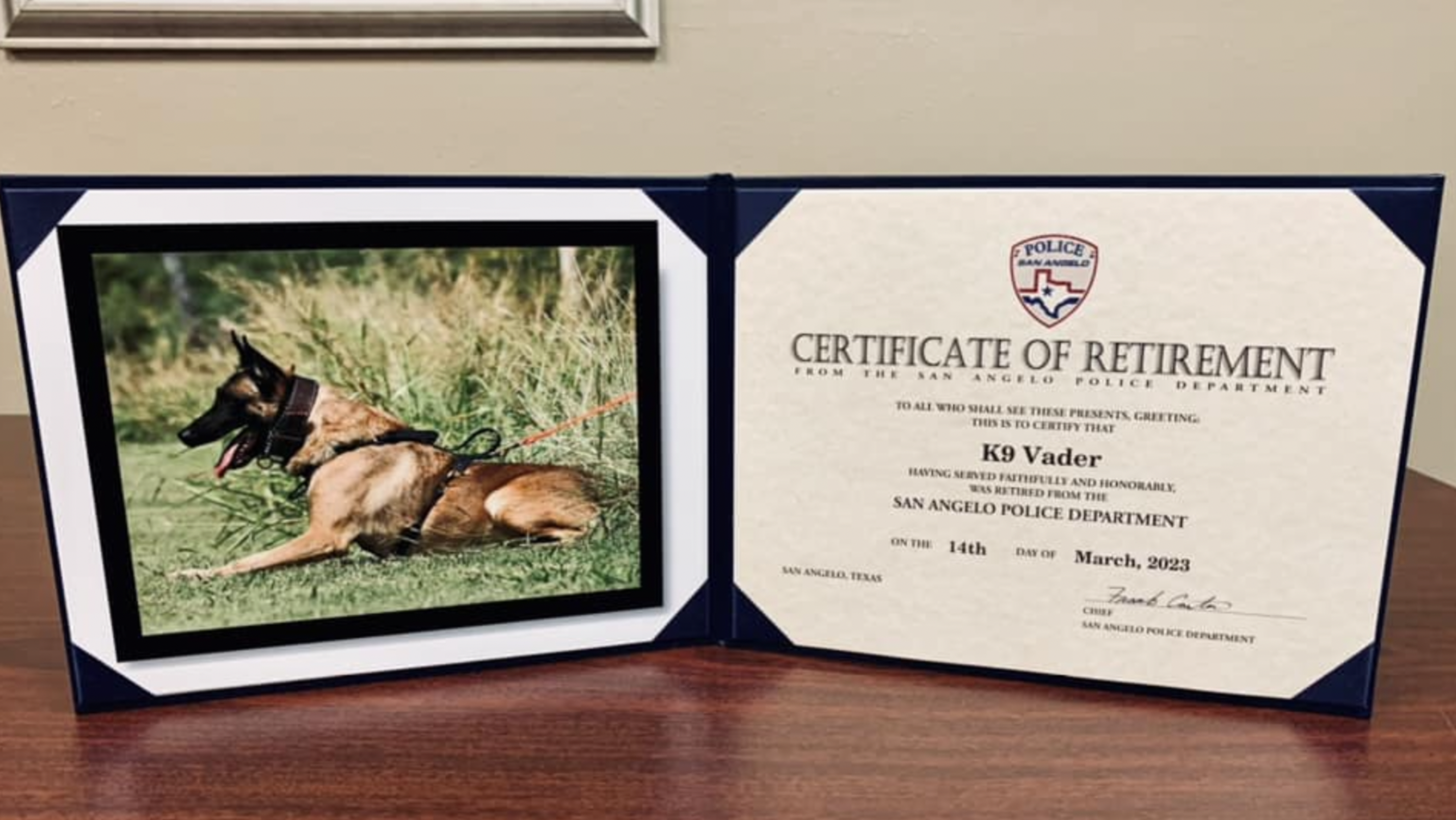 The San Angelo Police Department and our community thank Police K9 Vader for his incredible service. We all hope he will enjoy being a regular dog with a family that will care for him for the rest of his life.