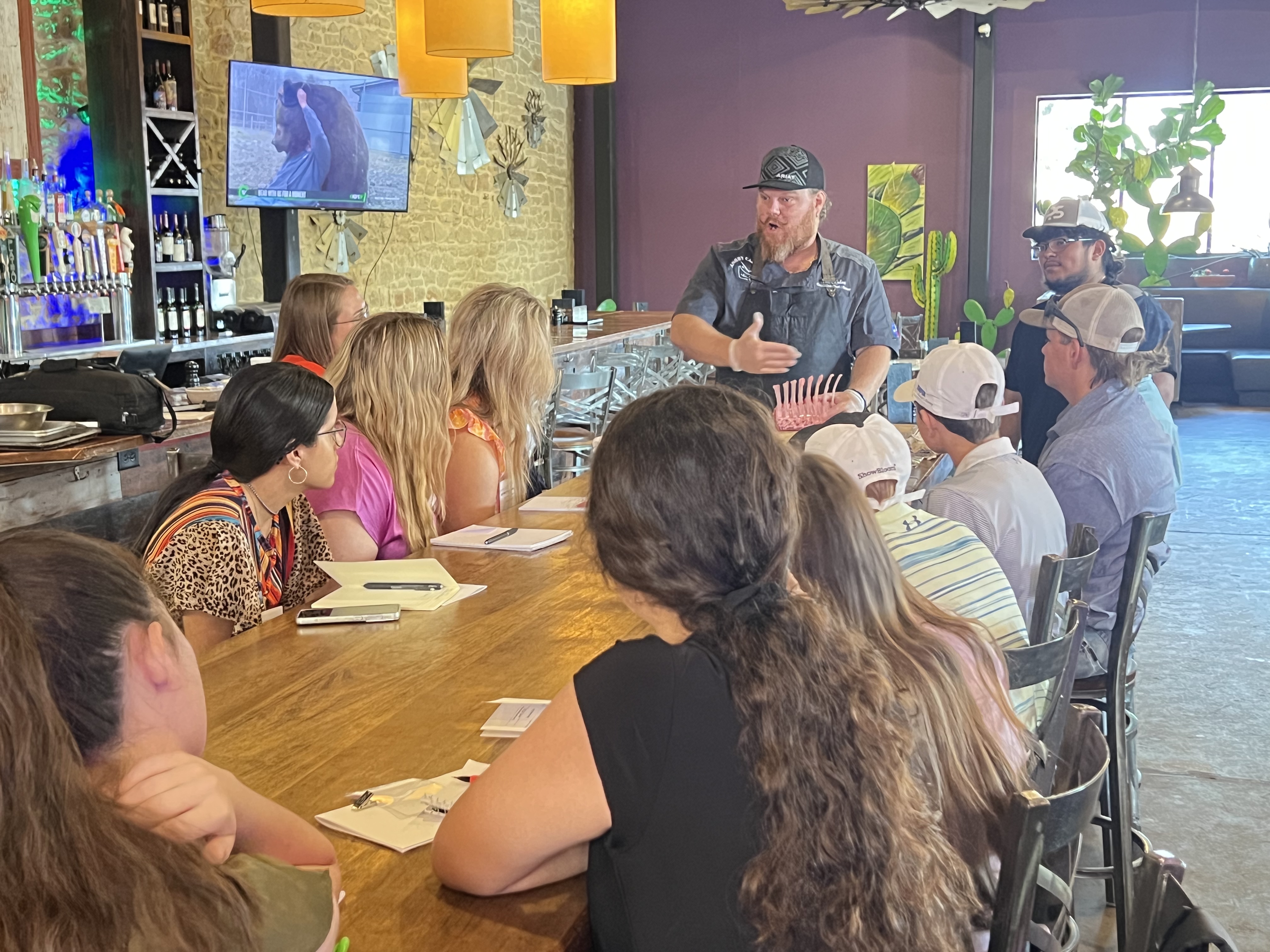 During the Texas A&M Ag Extension Agency’s Texas Youth Sheep and Goat tour, on June 26, 2023, the group of 10 to 12 students from local high schools stopped at the Angry Cactus to learn how to Roast, Grill, and Braise a rack of lamb.