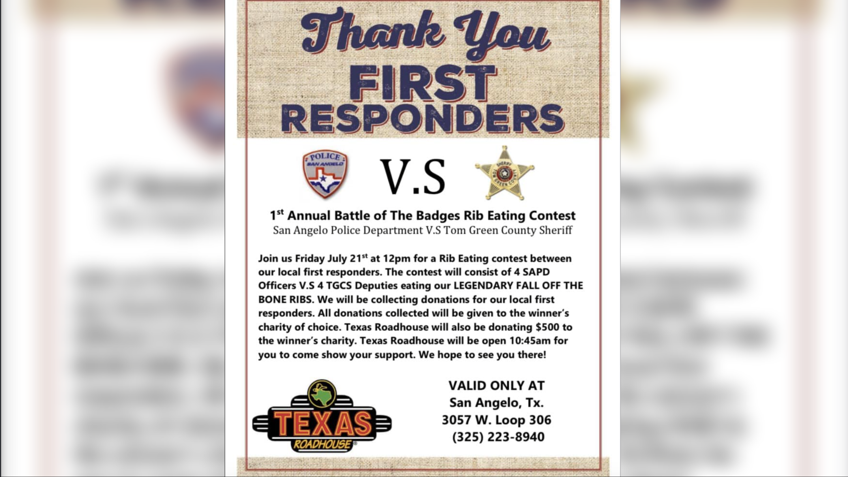 SAN ANGELO, TX — The San Angelo Police Department announced on Tuesday, July 18, that the Police Department will collaborate with the Tom Green County Sheriff's Office in the “1st Annual Battle of the Badge Rib Eating Contest.” On Friday, July 21, the contest will take place at Texas Roadhouse, located at 3057 W. Loop 306 in San Angelo.