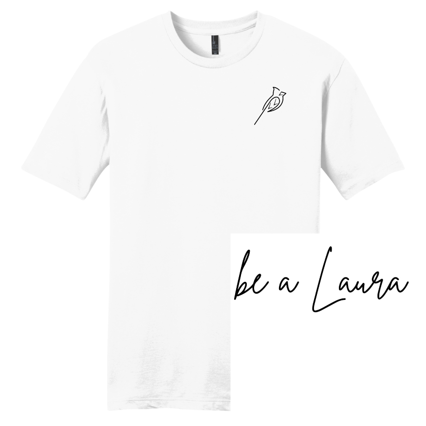 The front of the shirt features a cardinal with her initials woven in, and the back features the simple phrase, "be a Laura."