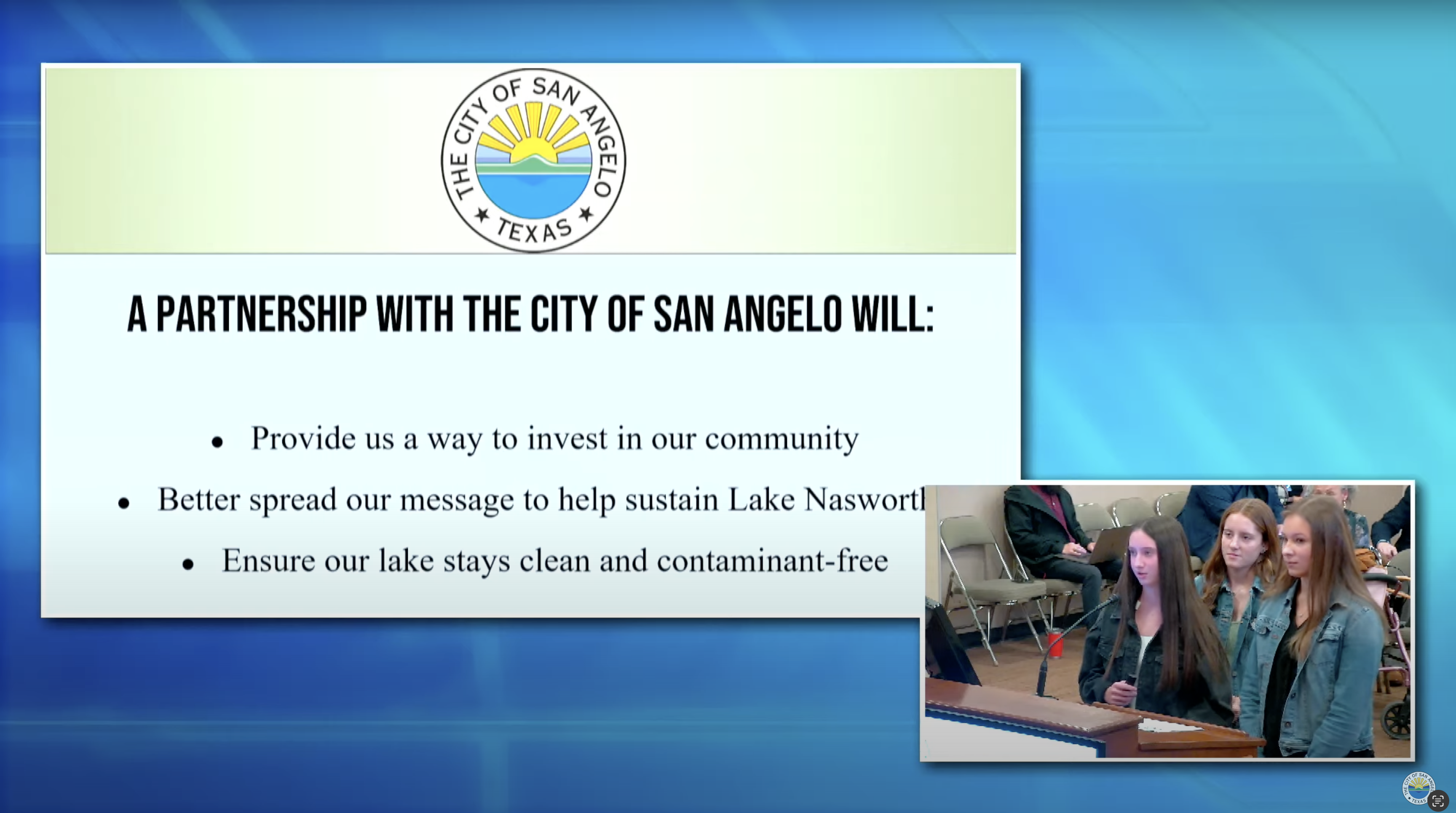 SAN ANGELO, TX – In a unanimous decision, the City of San Angelo has approved a resolution accepting a generous donation from Wall Sophomore FCCLA (Family, Career, and Community Leaders of America) students. The resolution solidifies a partnership aimed at raising awareness, educating the public, and implementing projects to address contamination issues at Lake Nasworthy. The Wall Sophomore FCCLA students, represented by Ainsley Jameson, Ella Taylor, and Isabella de la Pina, presented their project, titled "Nursing Nasworthy," during a recent city council meeting. |