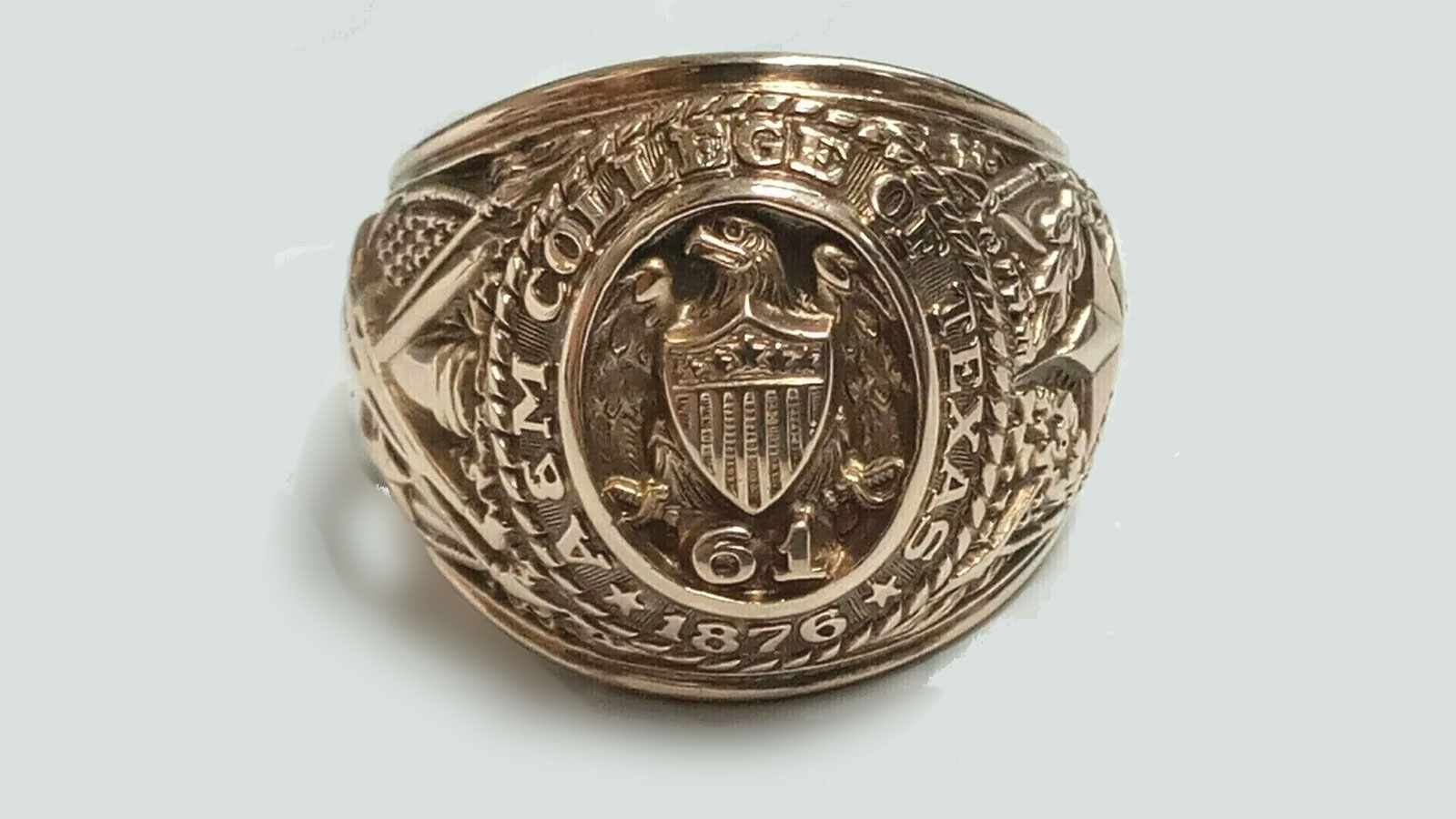 Despite its nearly 60-year age, though worn, the ring retains its distinctive features. It is a solid gold ring without any gemstones, following the traditional Aggie Ring style. Inscribed inside the ring is the owner's name, ensuring its unique identity. One side of the ring features the Texas and United States flags set behind crossed cannon, rifle, and saber. On the opposite side, the ring displays the State of Texas seal, as authorized by the constitution of 1845. This seal comprises a five-pointed star encircled by a wreath of olive or laurel leaves. The words encircling the crown may read either "A&M College of Texas – 1876" or "Texas A&M University - 1876," reflecting the university's transition from a college to a university in 1963, allowing graduates to choose the name they prefer.