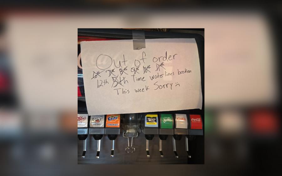 At The Pit BBQ, a hand-written sign taped to the soda machine reads, “Out of order – 12th time water lines broken this week – Sorry :(.”
