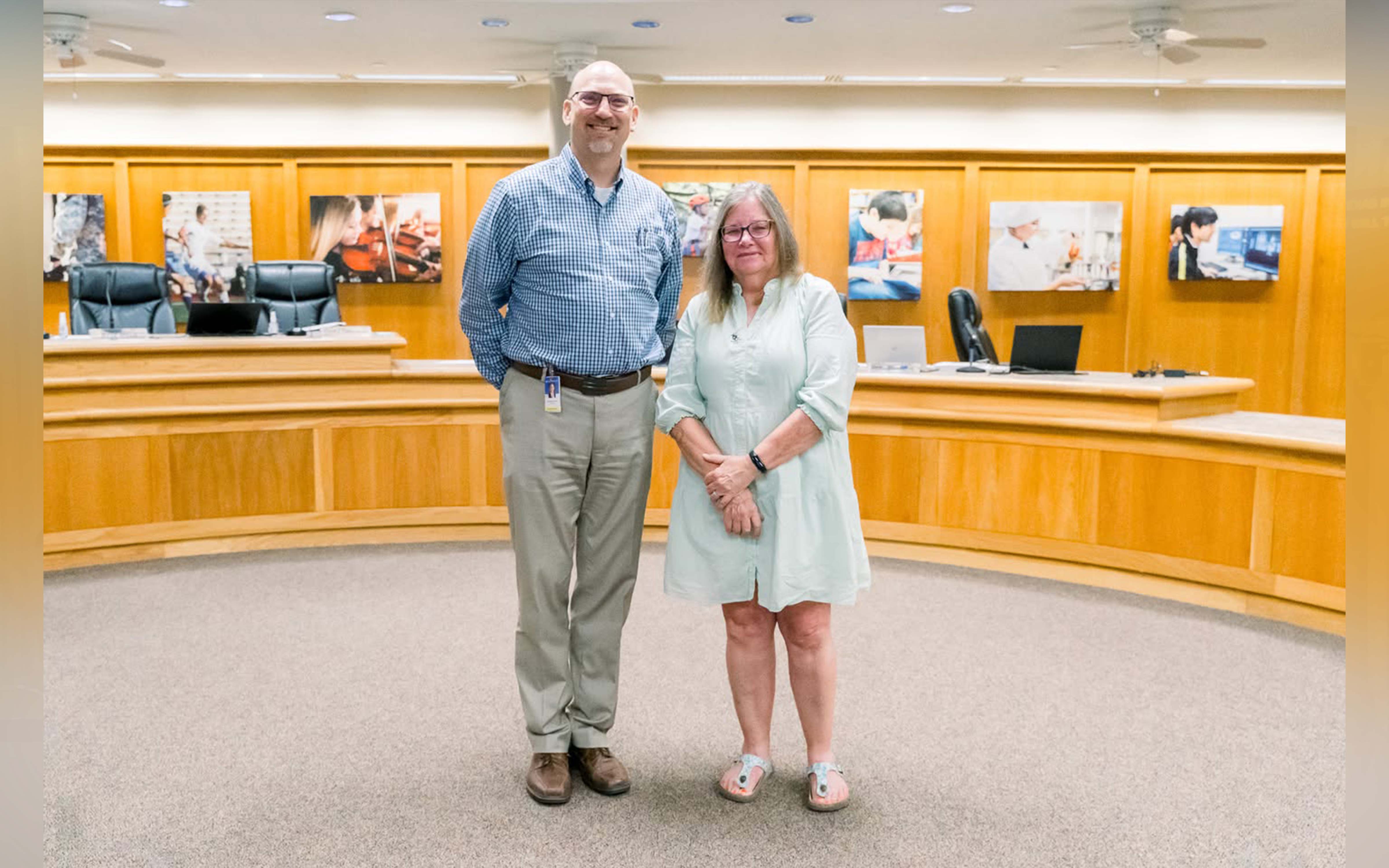 Santa Rita Elementary teacher Lynn Springer, San Angelo ISD’s 2024 Elementary Teacher of the Year, stands with Superintendent Dr. Chris Moran following her recognition at the June 16 school board meeting. (Photo by: San Angelo ISD)