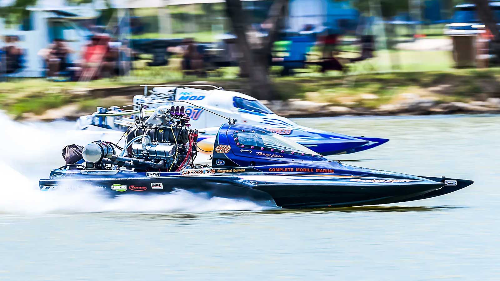 The drag races include boats that top speeds of 200 miles per hour.