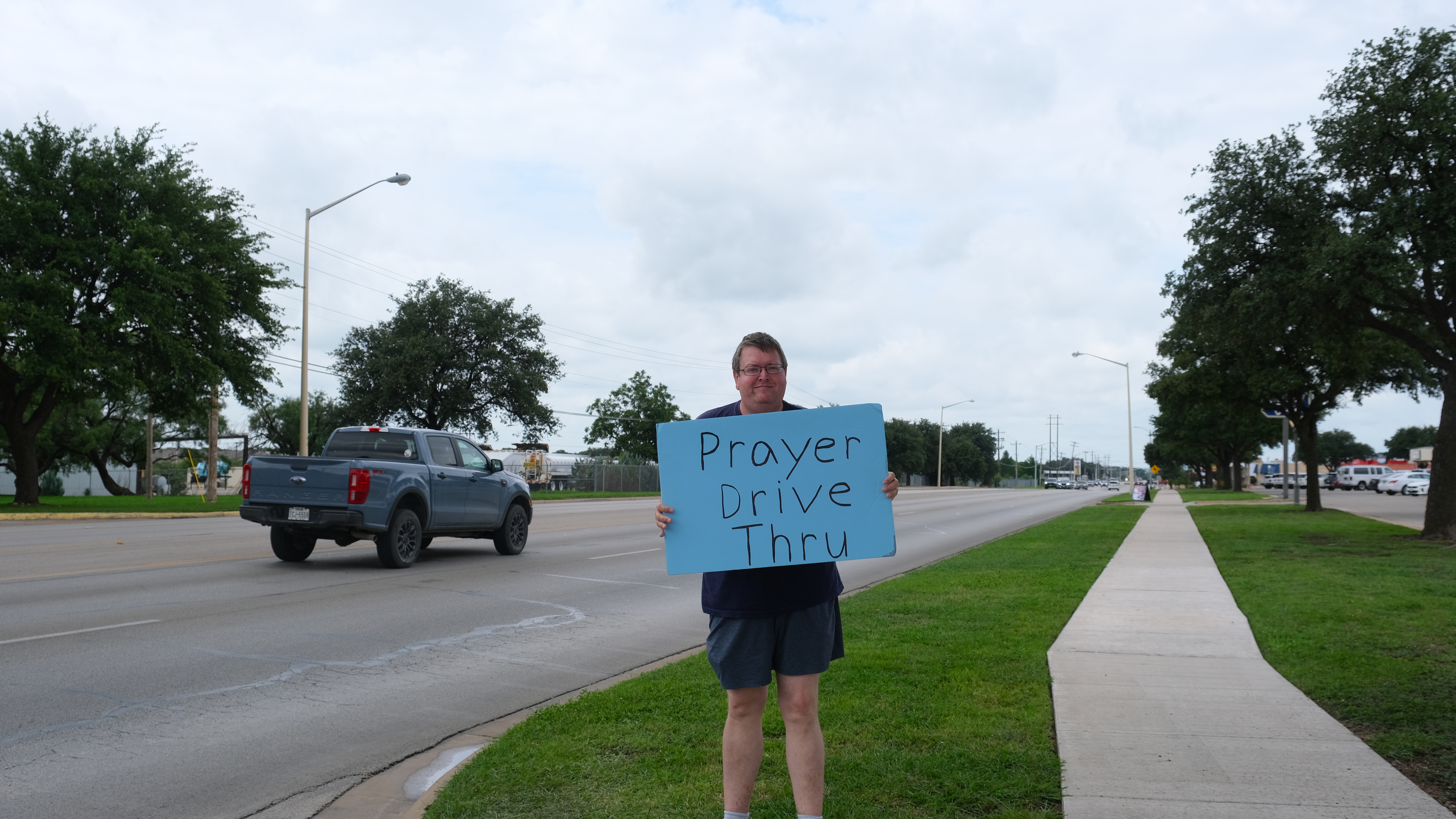 SAN ANGELO, TX — Clutching a bright blue sign reading “Prayer Drive Thru,” Lonnie Bingham stands near the intersection of Southland Boulevard and Knickerbocker Road several afternoons each week, offering free prayers to anyone willing to pull over.