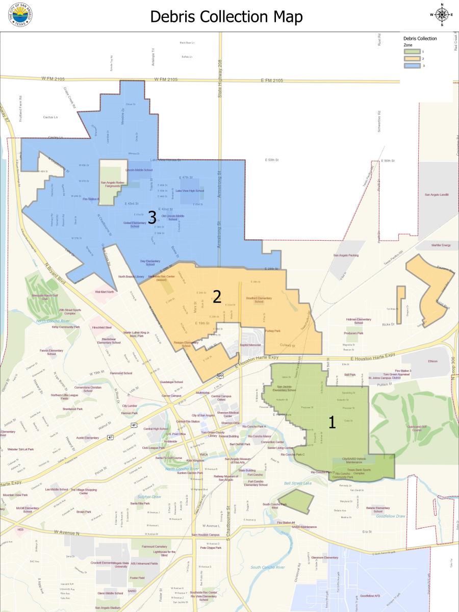 SAN ANGELO, TX - The City of San Angelo has contracted Ceres Environmental to handle storm debris removal. Collection will begin Monday, July 21, with crews focusing first on zone 1 and the portion of zone 3 along 37th Street.