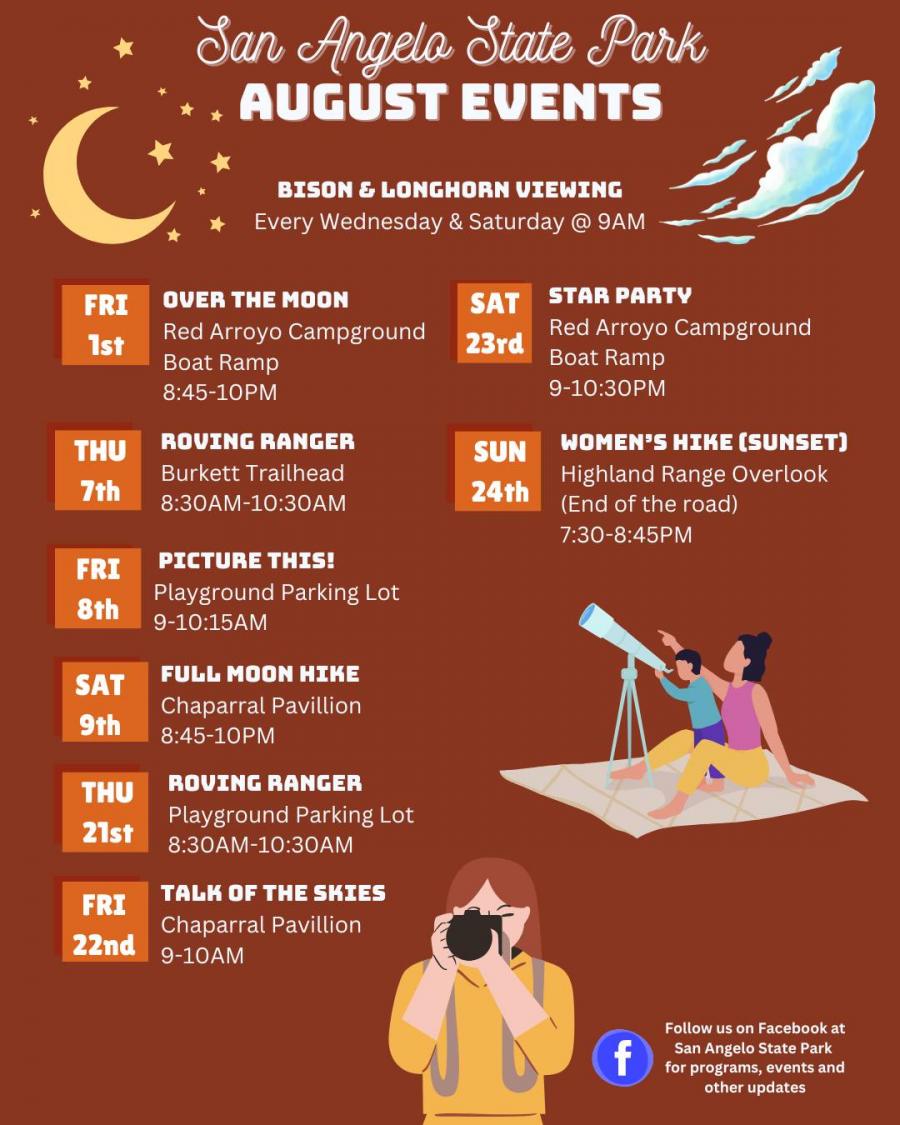 The month’s events begin Aug. 1 with “Over the Moon,” where Ranger Kennie and local astronomers will explore the night skies of San Angelo.