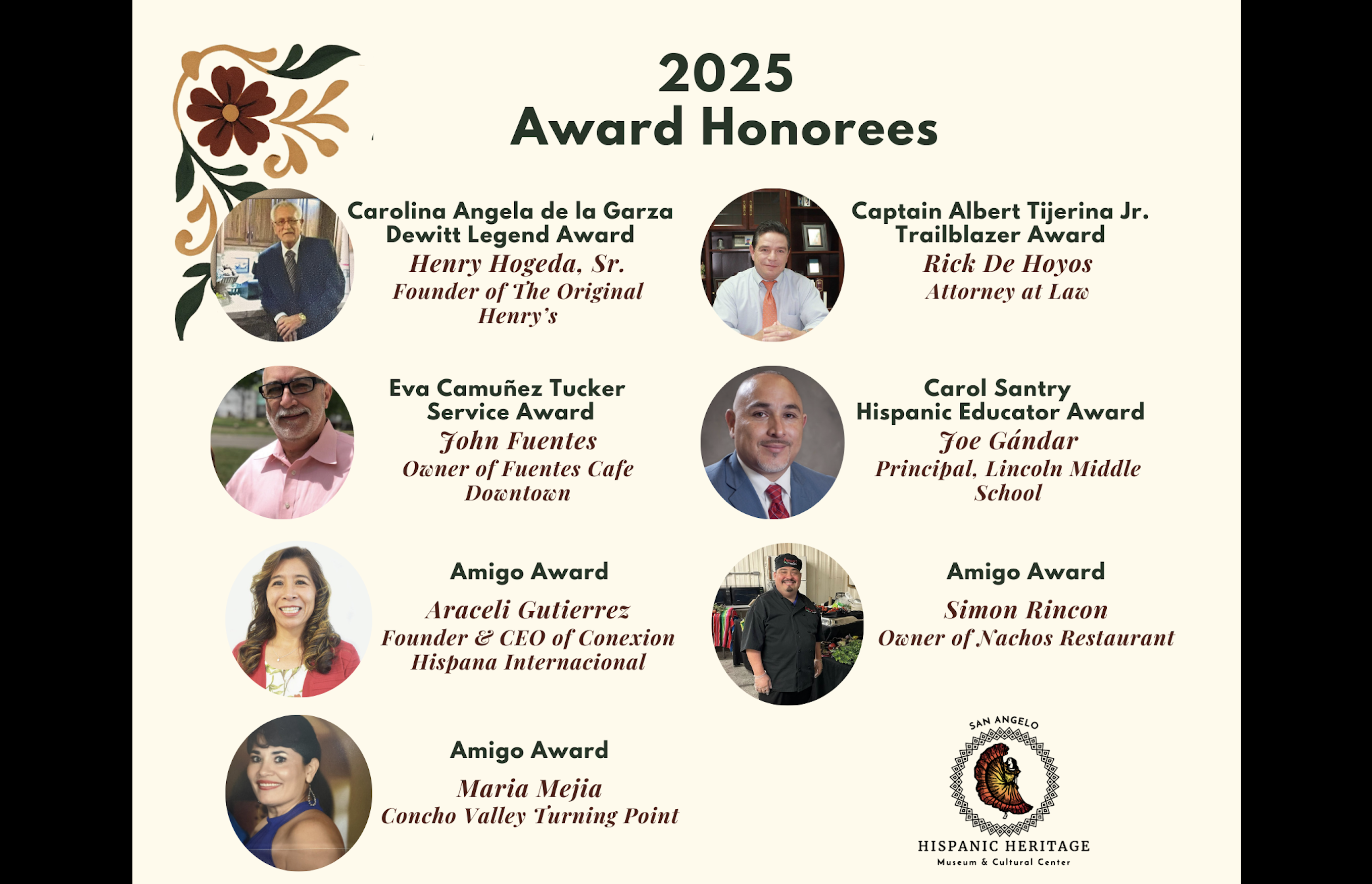 SAN ANGELO, TX — The San Angelo Hispanic Heritage Museum & Cultural Center announced this year’s recipients of its annual awards, honoring individuals who embody leadership, service, and cultural pride within the community.