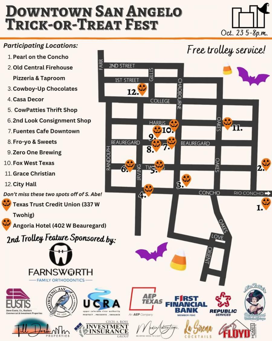 SAN ANGELO, TX — Downtown San Angelo’s annual Trick-or-Treat Fest will return Thursday, Oct. 23, from 5 to 8 p.m., offering free trolley rides, games, and plenty of candy across multiple downtown stops.