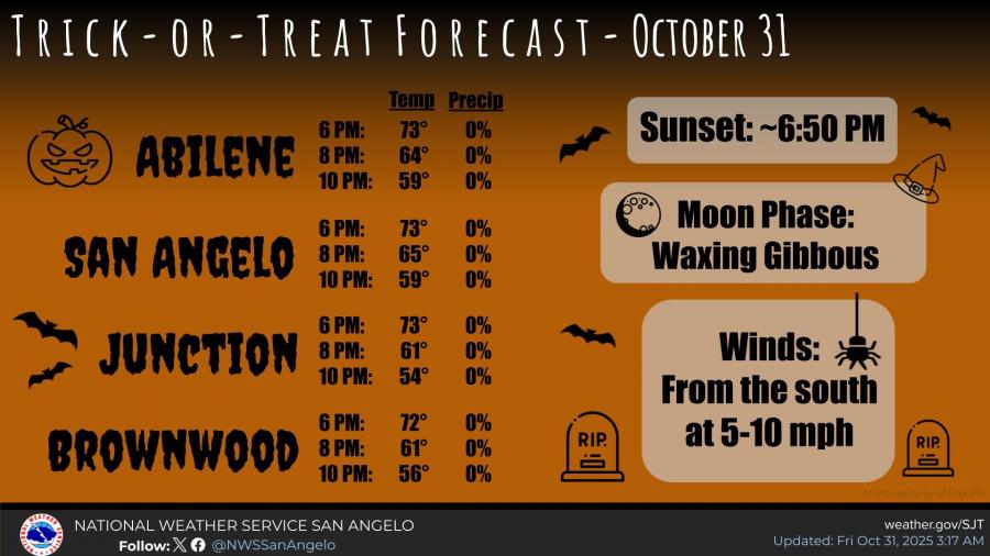 SAN ANGELO, TX — Families heading out for Halloween festivities can expect clear skies and mild temperatures this evening, according to the National Weather Service in San Angelo.