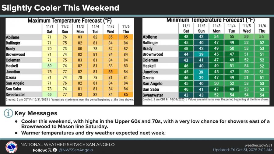 After Halloween, temperatures will dip slightly this weekend. Highs Saturday are forecast in the upper 60s to low 70s across the region, with lows in the mid-40s. Sunday warms into the mid-70s before returning to the low 80s early next week. Rain chances remain very low.