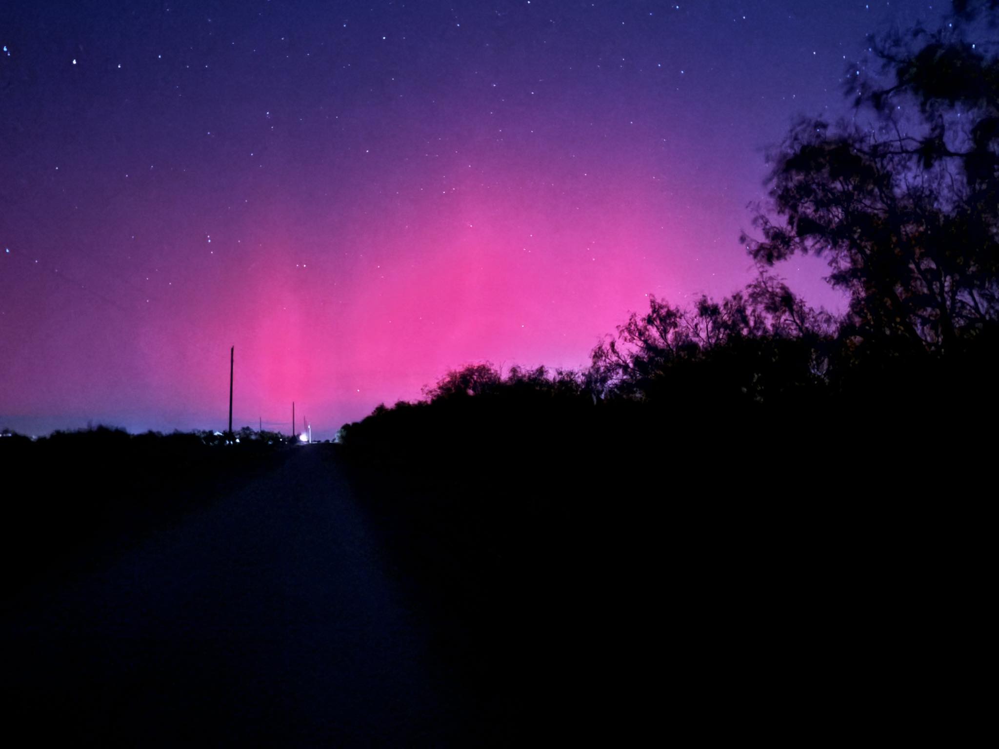 The U.S. National Weather Service in Abilene and San Angelo confirmed the aurora borealis was visible to the north, sharing photos taken west of San Angelo by an off-duty meteorologist. Shades of red, pink, and purple glowed across the horizon as a powerful G4 geomagnetic storm reached Texas.
