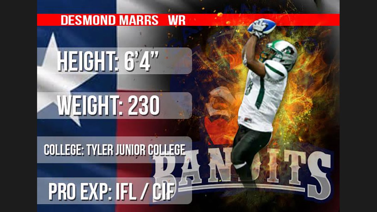 Marrs (6’4” 230 lbs / WR), played his college ball at Tyler Junior College before starting his professional career in the IFL with the Wyoming Calvary. Last season, Marrs played one game for the Bandits pulling in 4 catches for 48 yards. Marrs will be joining rookie receiver Stephen Alfred and former Angelo State University defensive lineman Kyle Patterson.