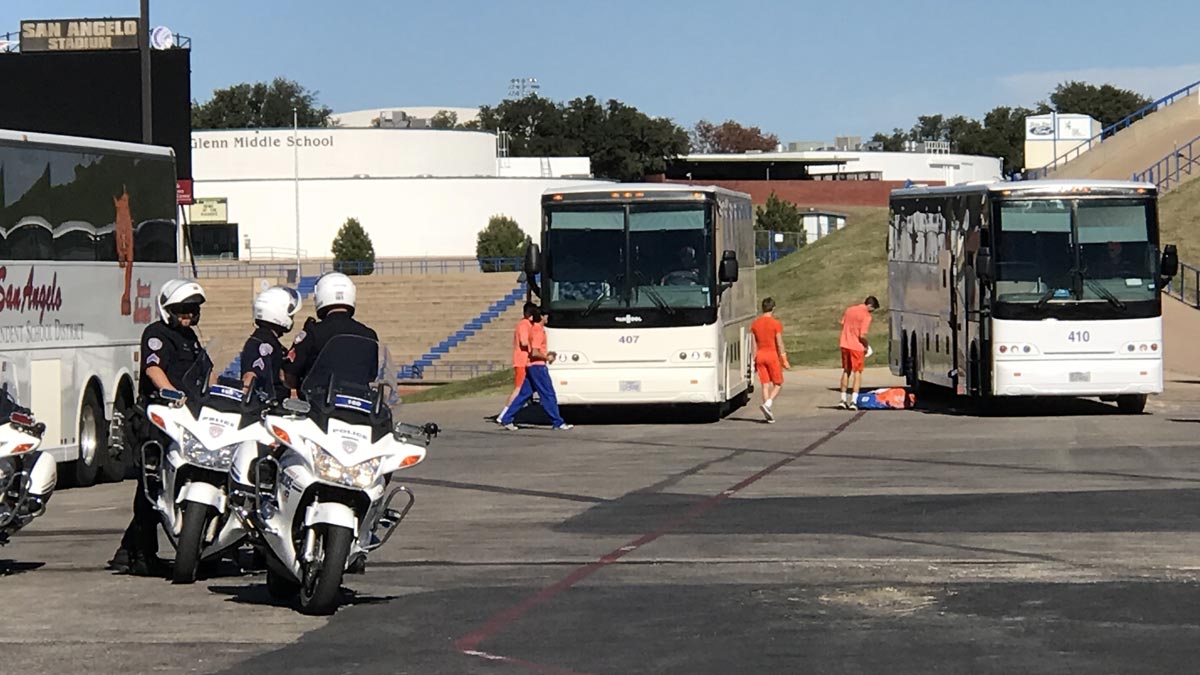 The three-bus armada departed the San Angelo Stadium field house at 11:36 a.m. this morning with three San Angelo police motorcycle escorts. The buses turned southwest of Knickerbocker Rd. for the trip to Mansfield.