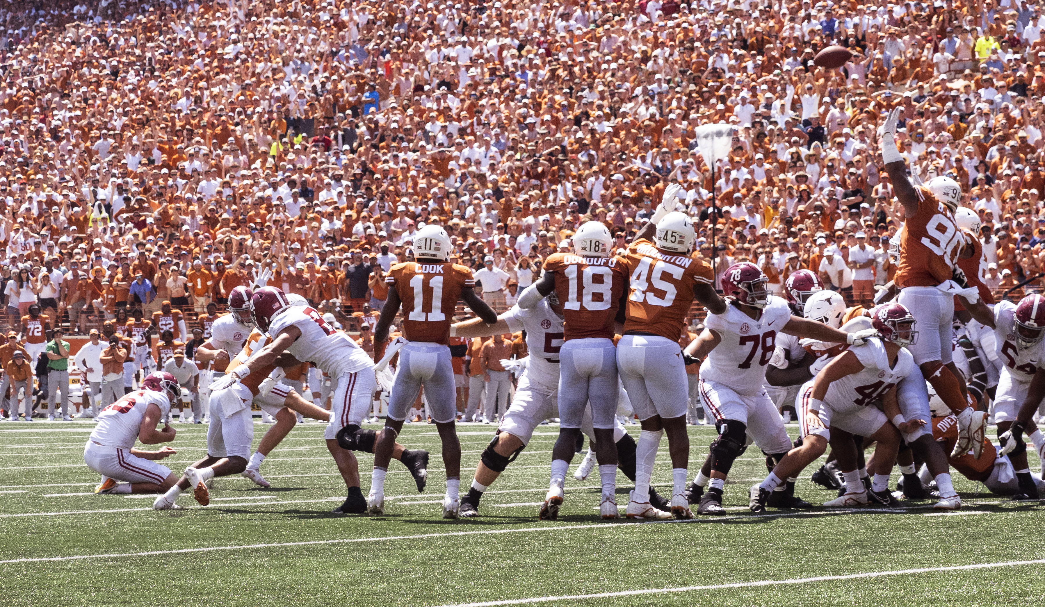 The Longhorns held a 2-point advantage with 1:29 to go in the 4th quarter. With the ball at the Texas 37-yard line and time running out, Bryce Young avoided a potential game-ending sack and turned the scramble into a 20-yard gain. Armed with a fresh set of downs and 17 seconds to go in the game, the Crimson Tide kicked the game-winner to survive, 20-19.