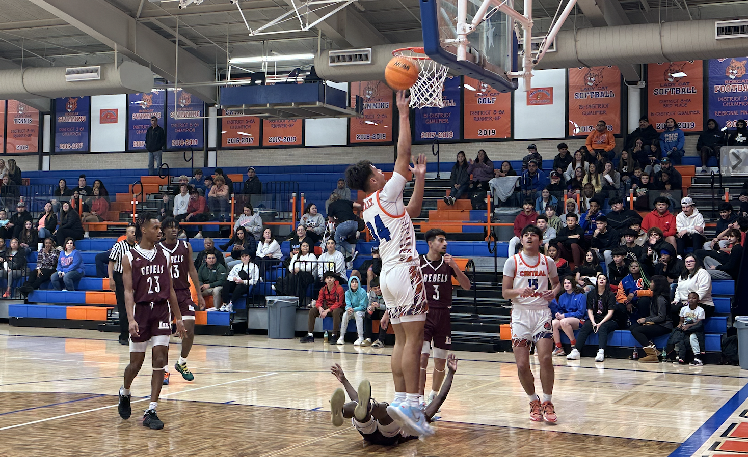 Jacob English jumped out to a hot start shooting the basketball and hit two threes in the first quarter. The ‘Cats’ defense showed their prowess early and held the Rebels to 24 points by halftime. Central went into the break up 46-24.