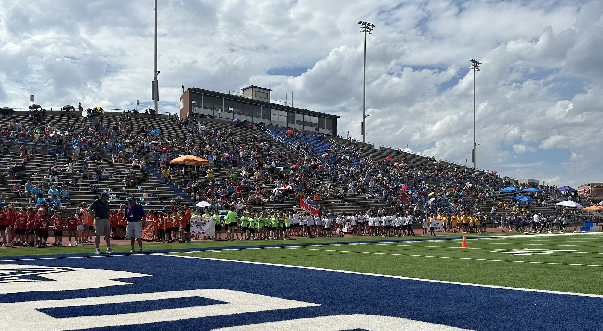 Before the lightning ultimately ruined the fun, the students and their teachers gathered on the track to represent their schools. They carried their school’s flags around the track before they ran together across the football field during the opening ceremonies. After that, field events began. There were more than just San Angelo schools present. Wall, Christoval, Miles, Veribest, and Grape Creek also sent their elementary schools to San Angelo Stadium.