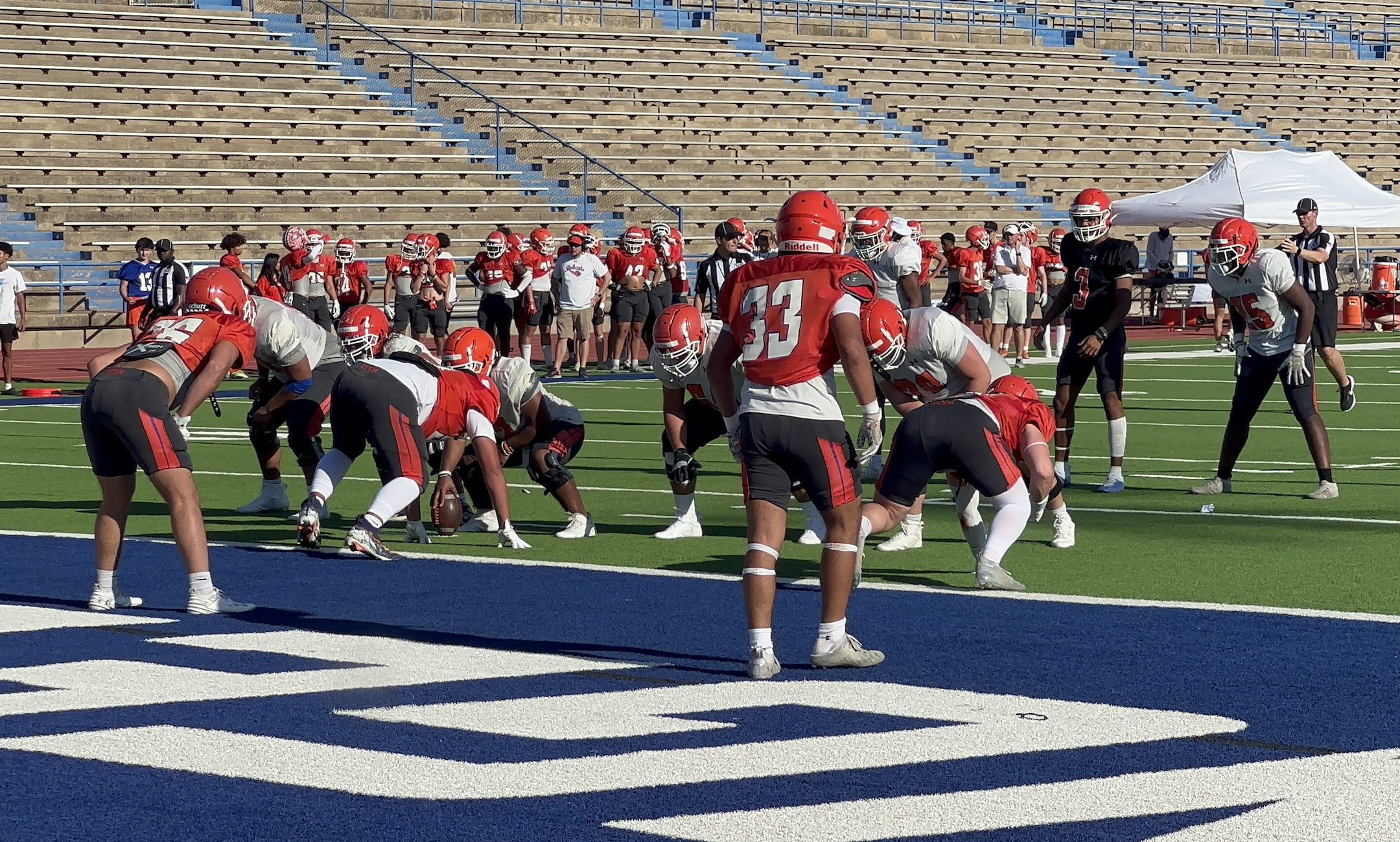 Throughout his tenure in San Angelo, first as the offensive coordinator and now as head coach, Coach Kevin Crane once again brings a potent offensive scheme to the field. The Bobcats snapped off chunk plays with their playmakers on several different occasions. Junior quarterback Christian English ran through all the reps with the 1’s and looked to solidify his spot as the starting quarterback. English made several pretty throws throughout the scrimmage. He was on time and accurate with the football, even when flushed out of the pocket. Like any new starter, he has areas where he can improve, rolling to his left and throwing on the run, but his deep balls looked crisp with plenty of air underneath them.