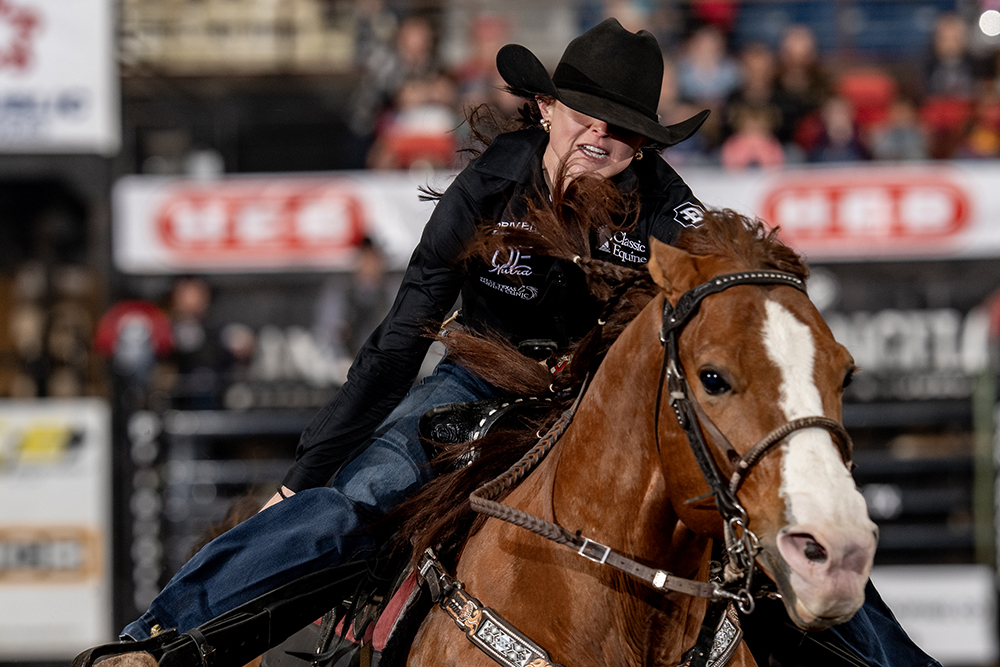 She rounded the cloverleaf pattern in 14.04 seconds during Sunday’s fourth performance inside CRC Roofers Coliseum to not only take the second-round lead but also moved into the top spot in the two-run aggregate with a cumulative time of 30.04 seconds.
