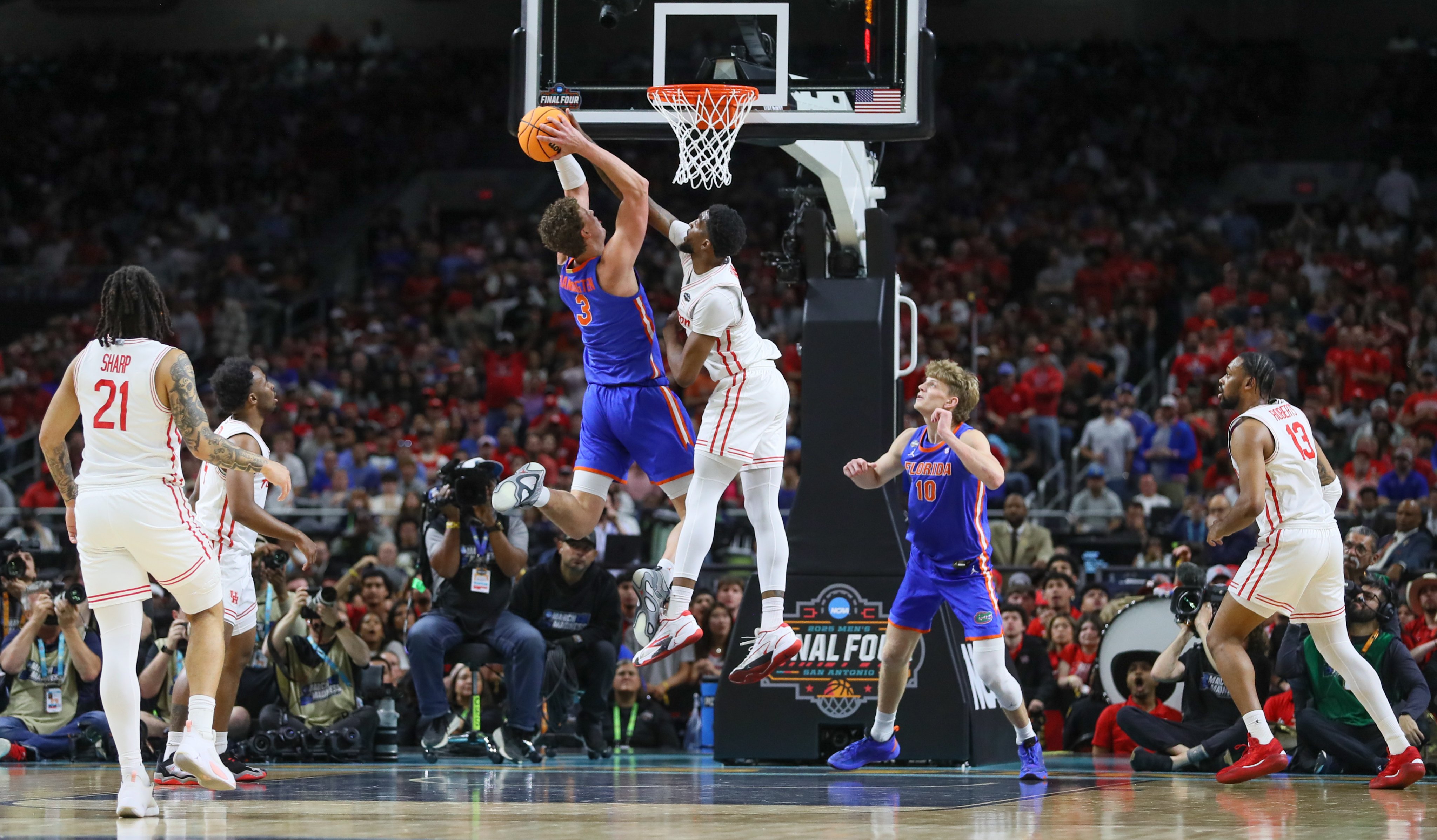 Houston’s Emanuel Sharp was going to attempt a 3-pointer in the final seconds, but as he jumped to shoot it, Florida’s Walter Clayton Jr. ran out to contest the shot, and Sharp had to let the ball fall to the court.
