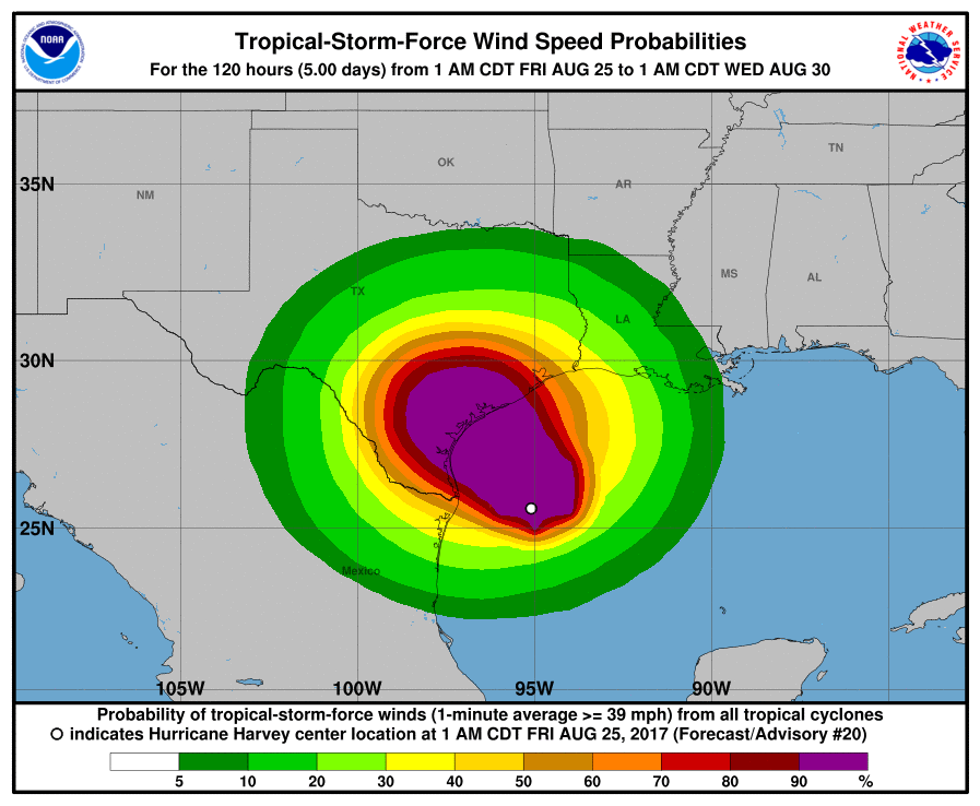 As Hurricane Harvey barrels toward the Texas coast, Texans are bracing for extreme flooding and potential damage to their communities. Harvey is currently a Category 2 hurricane, with winds around 100 miles per hour — but it could become nearly a Category 4 hurricane, with winds of 125 miles per hour, by the time it makes landfall this weekend. Some projections expect 15-25 inches of rain in areas along the coast.
