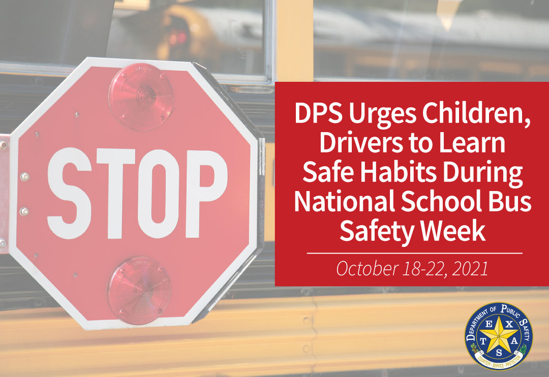 AUSTIN – National School Bus Safety Week is Oct. 18-22 and the Texas Department of Public Safety (DPS) would like to remind the public that they play an important role in ensuring the school buses make it to their destinations safely each day.